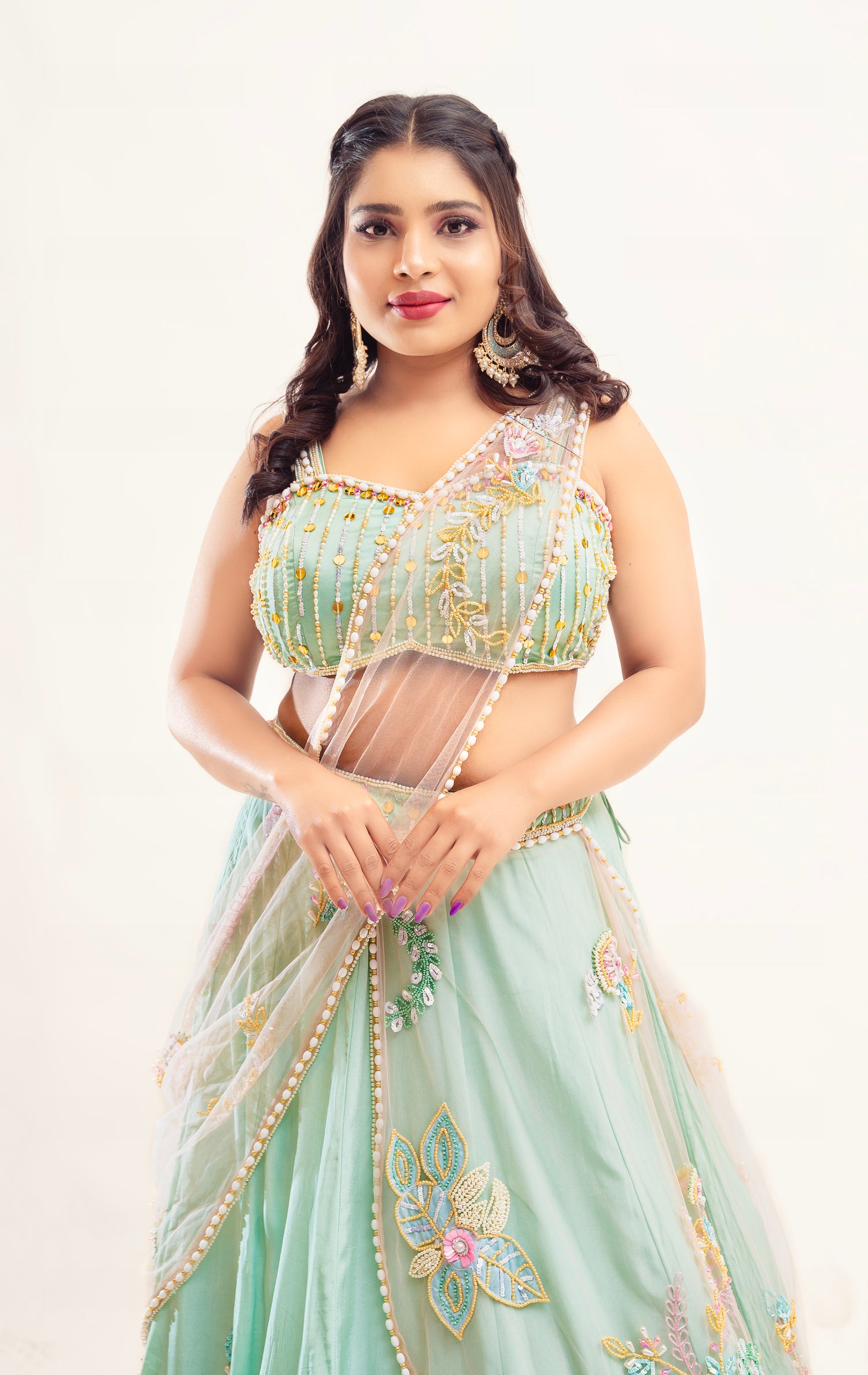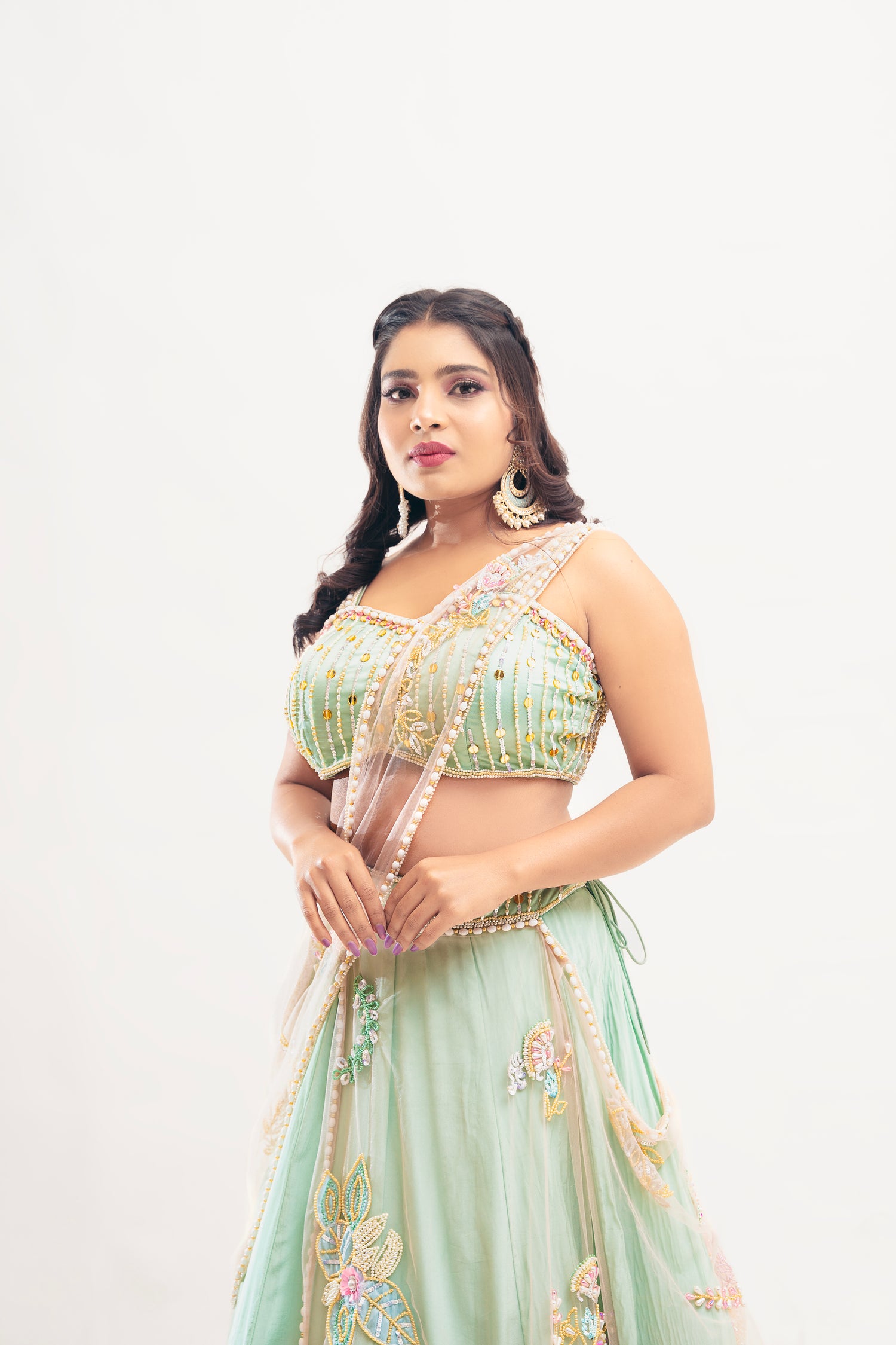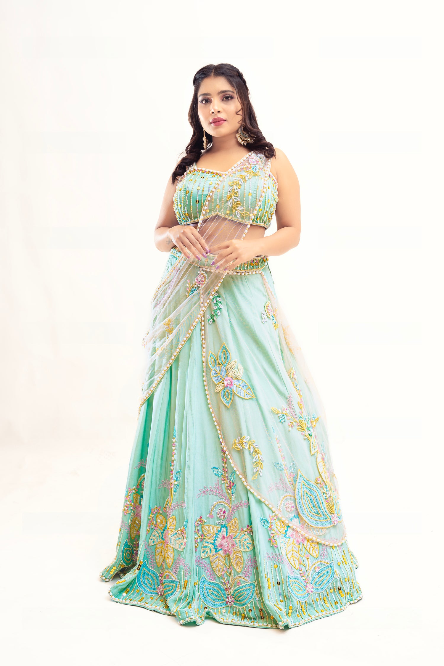 This lehenga exudes elegance and charm, making it ideal for weddings or festive events where a traditional yet eye-catching appearance is desired. The soft pastel tones combined with the vivid embroidery create a harmonious balance of subtlety and opulence.