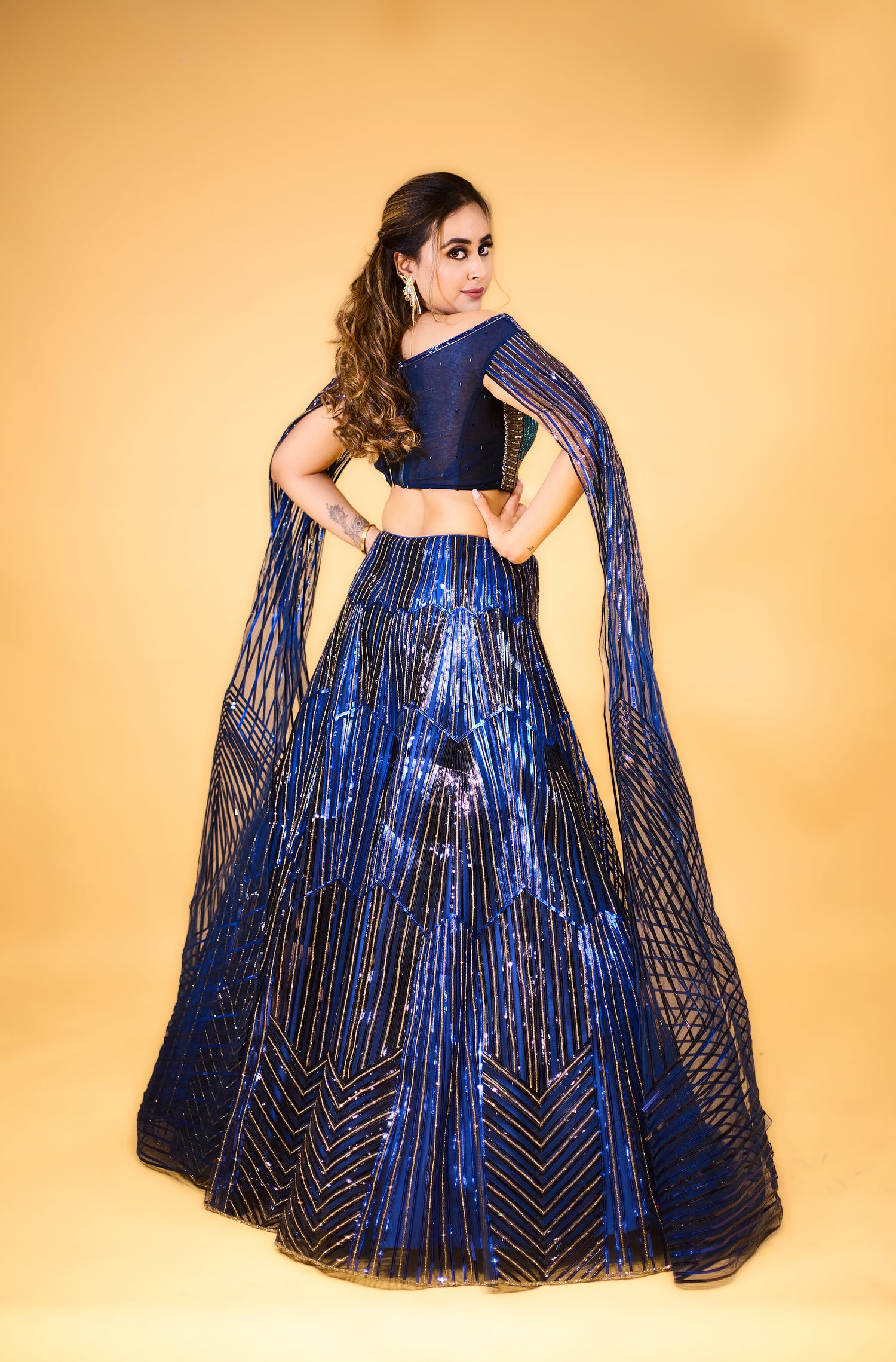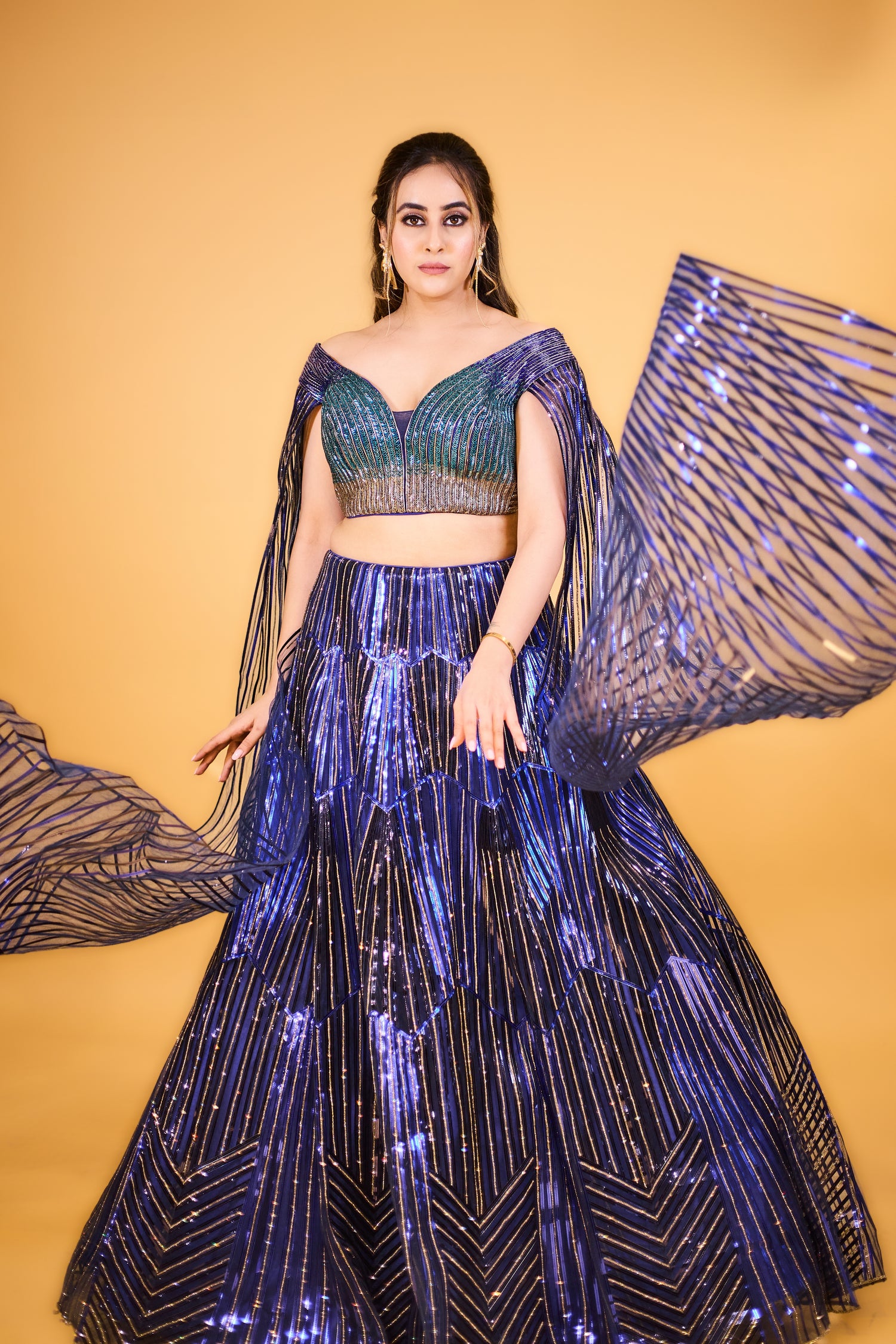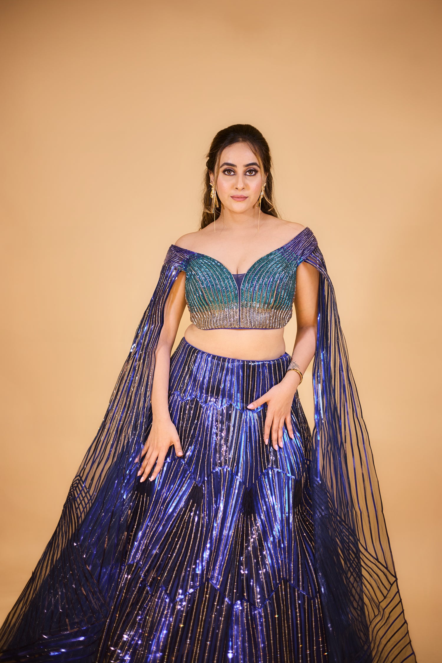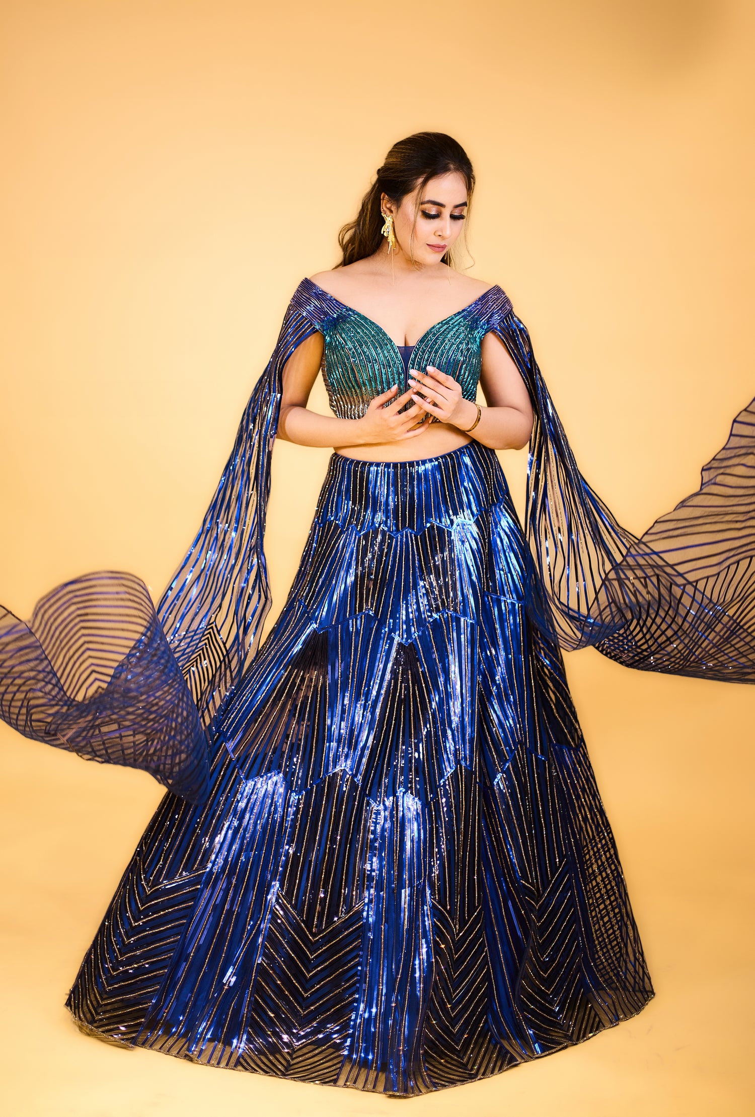 The Dress features a person wearing a shimmering, metallic blue lehenga with an embellished off-shoulder top and a flowing cape-style dupatta. The outfit looks glamorous, perfect for festive or celebratory occasions, such as weddings or parties. The design stands out with its combination of modern and traditional elements, particularly the sparkling fabric and structured silhouette.