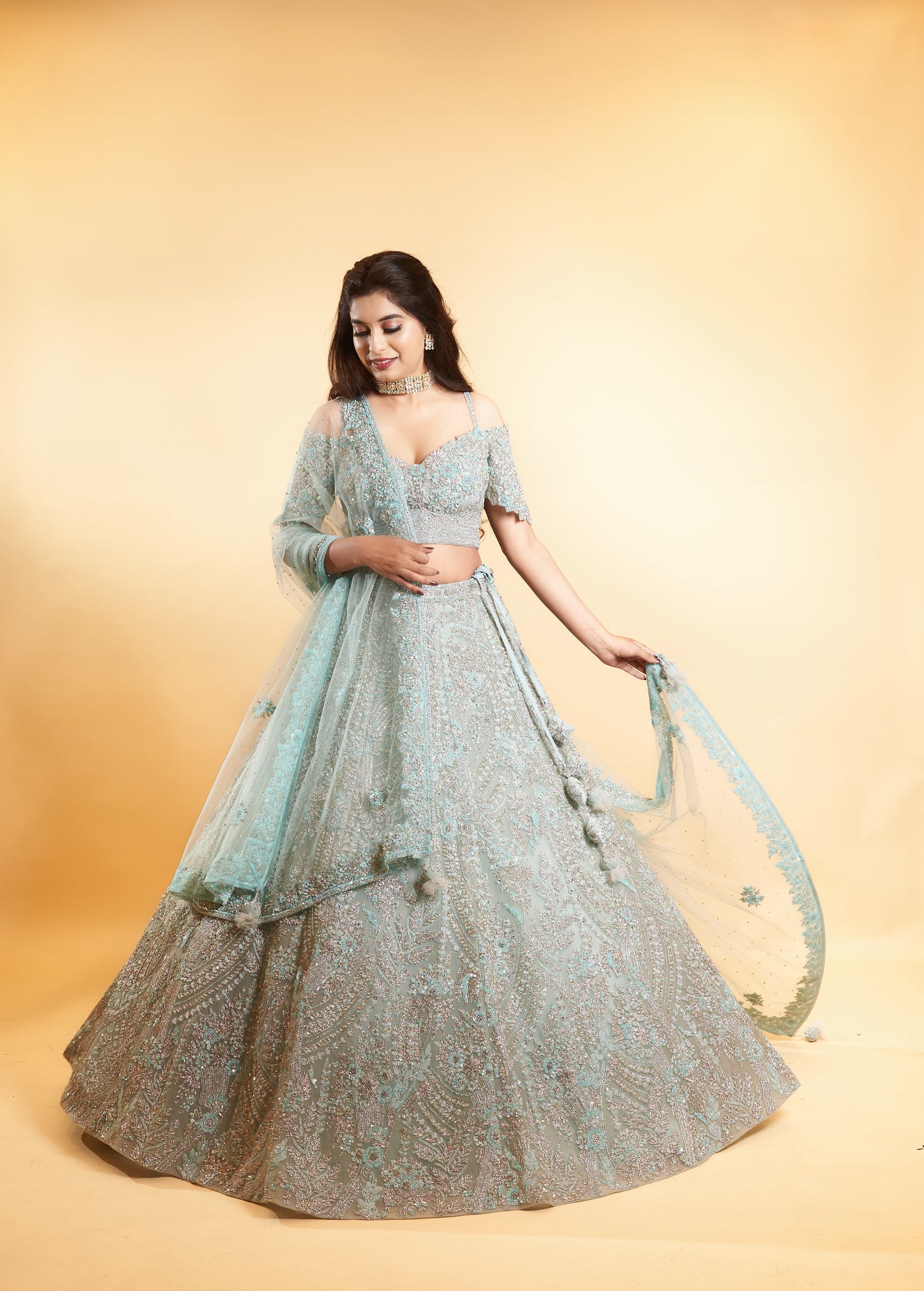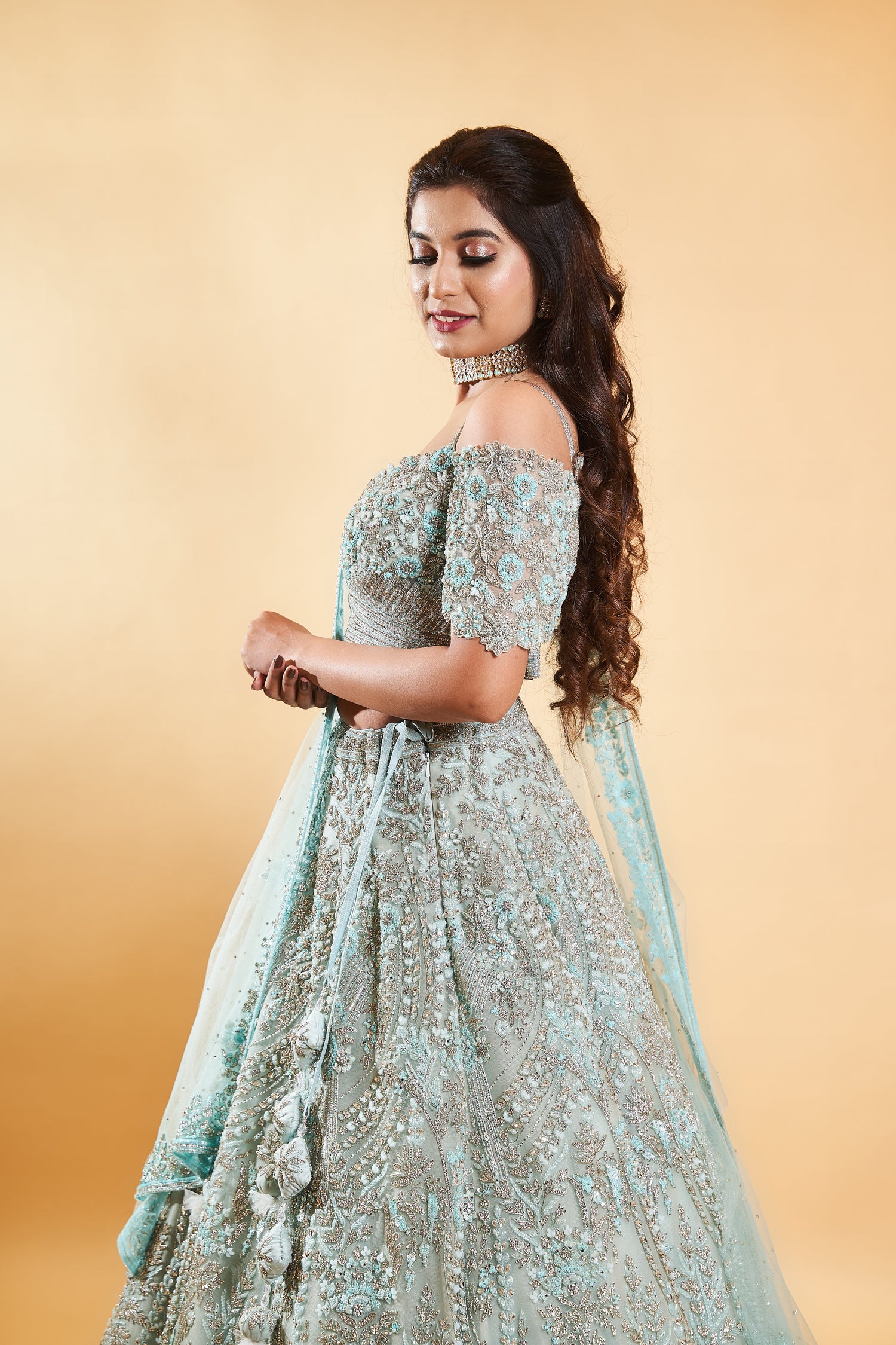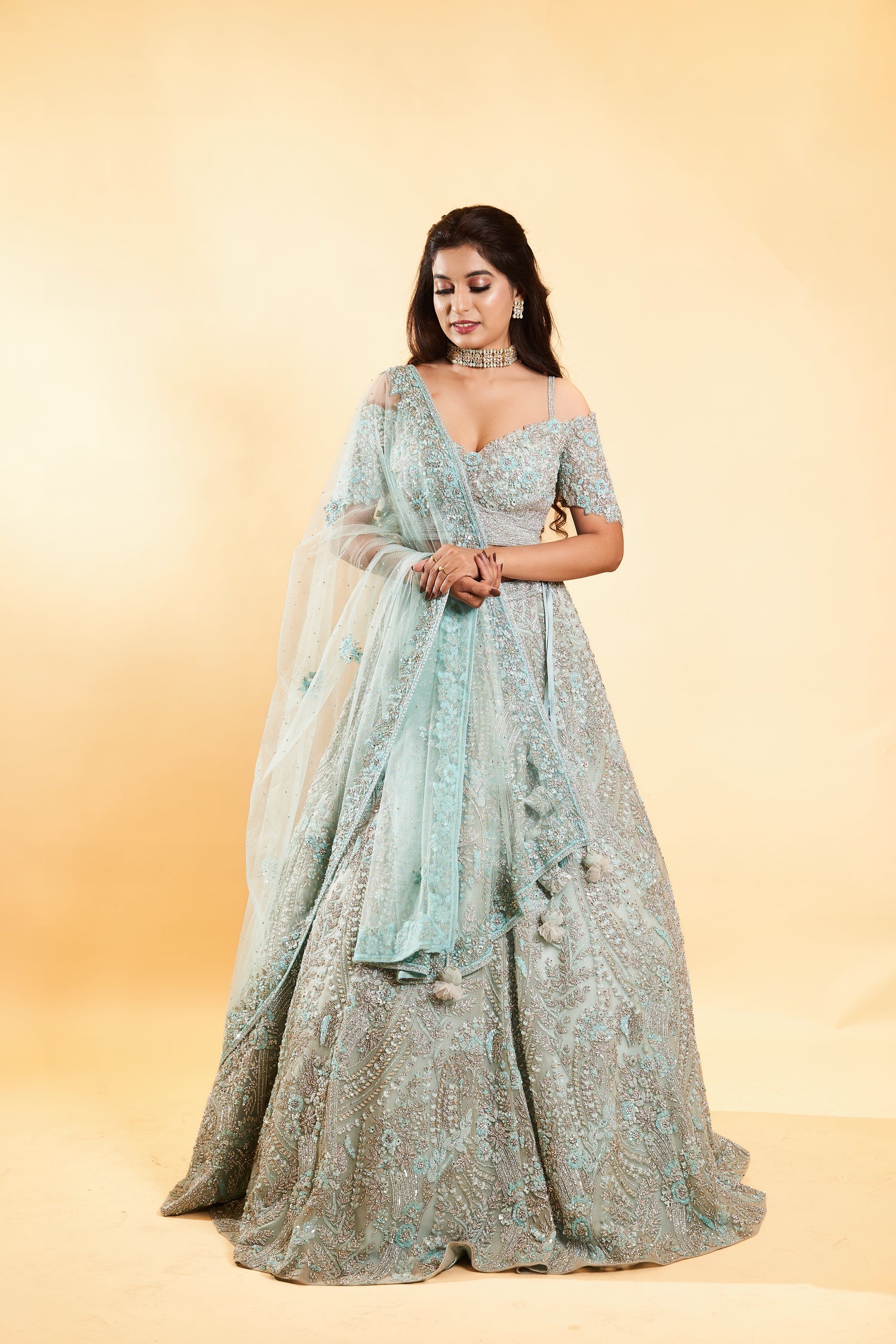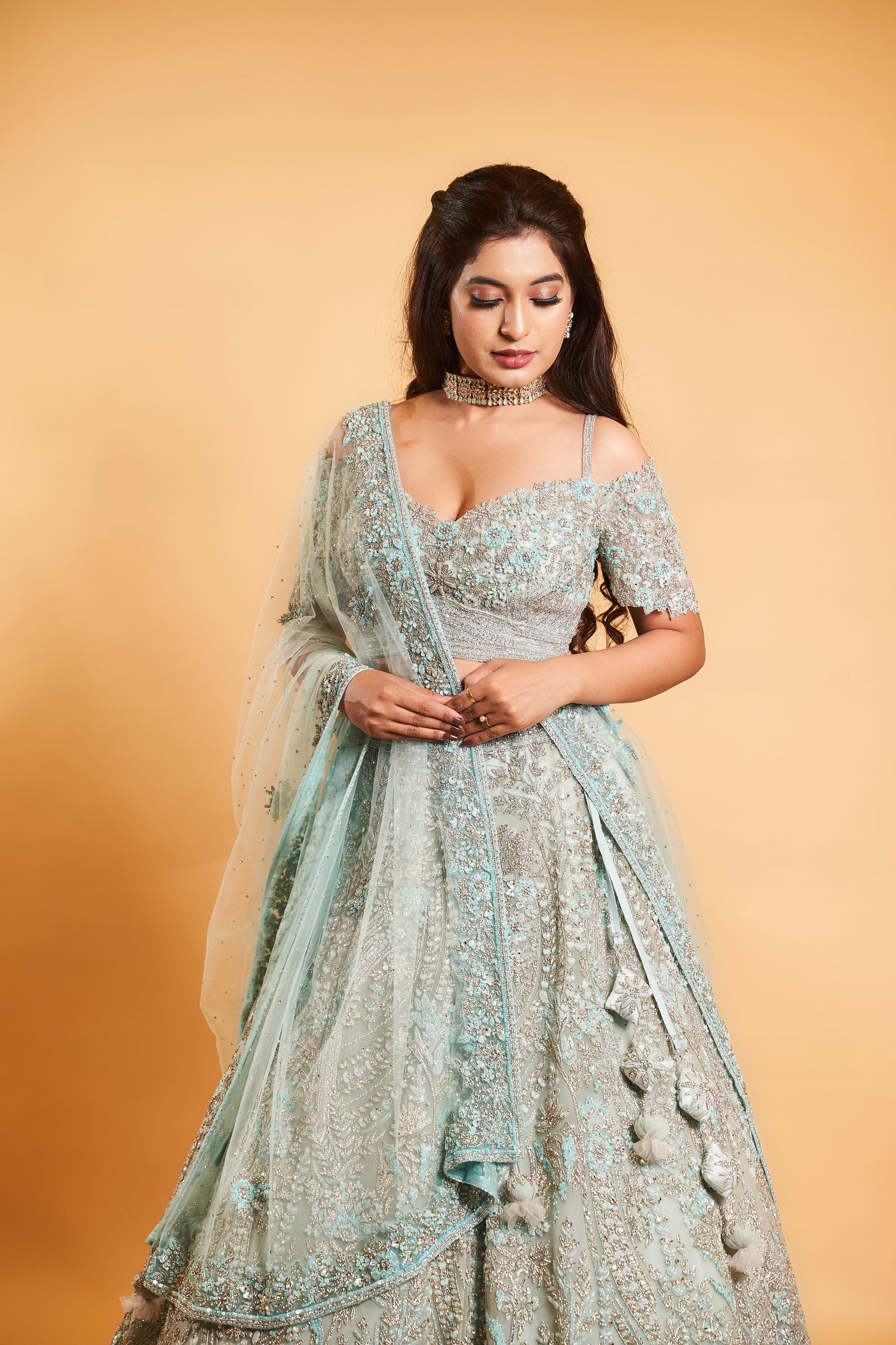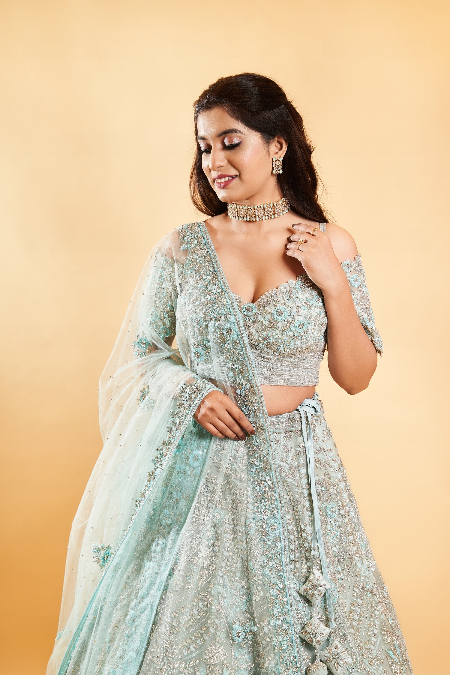 The dress features Soft pastel blue, giving a serene and elegant appearance. The lehenga is richly adorned with intricate embroidery, featuring floral and ornamental patterns. The embroidery appears to be done with silver and blue threads, giving it a luxurious and textured finish.Blouse has a sweetheart neckline with off-shoulder sleeves, featuring matching embroidery. It gives a modern and chic touch to the traditional attire. The sheer dupatta is draped gracefully over one shoulder. It has matching embroidery along the border and is light, adding a delicate touch to the ensemble.