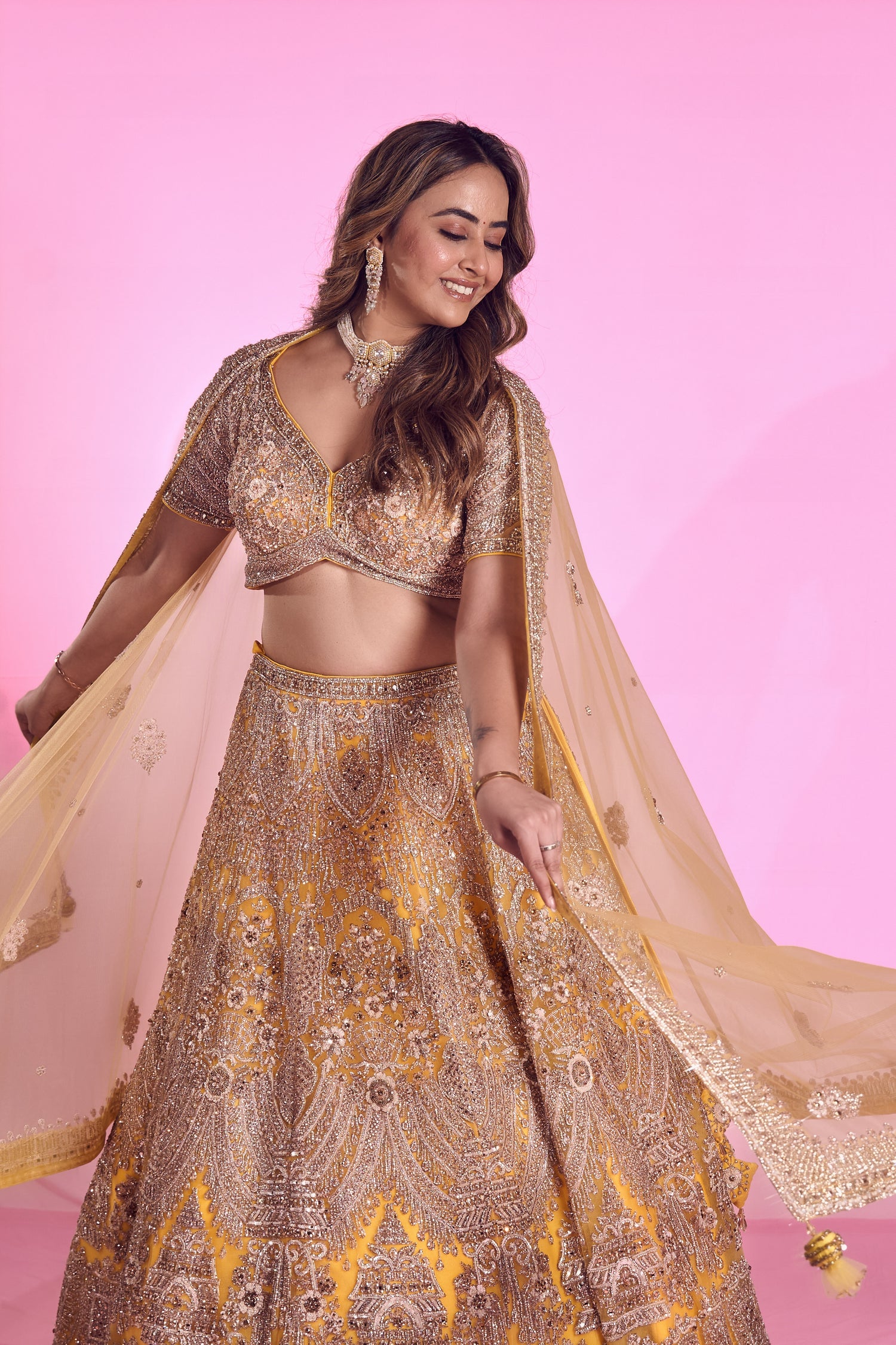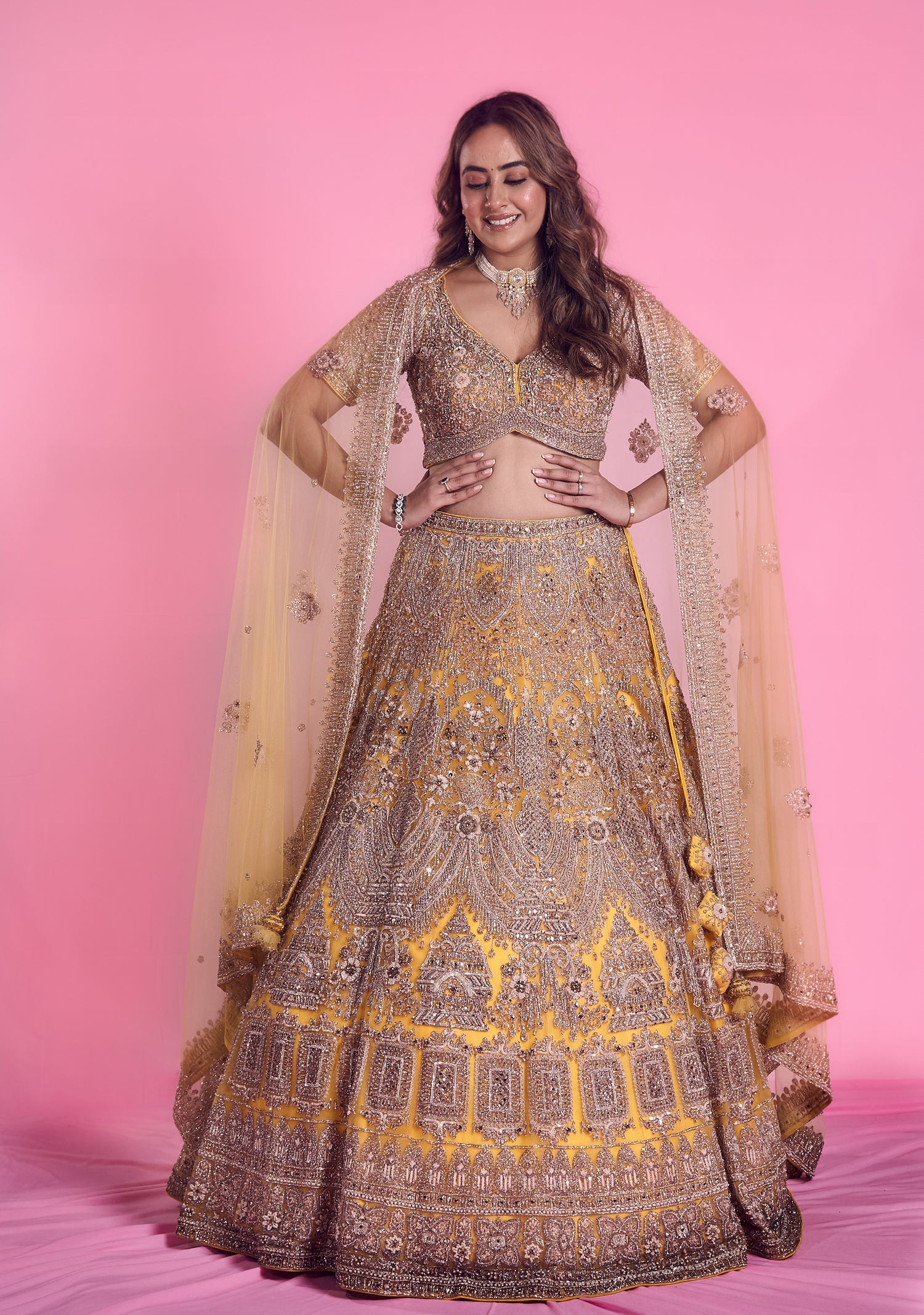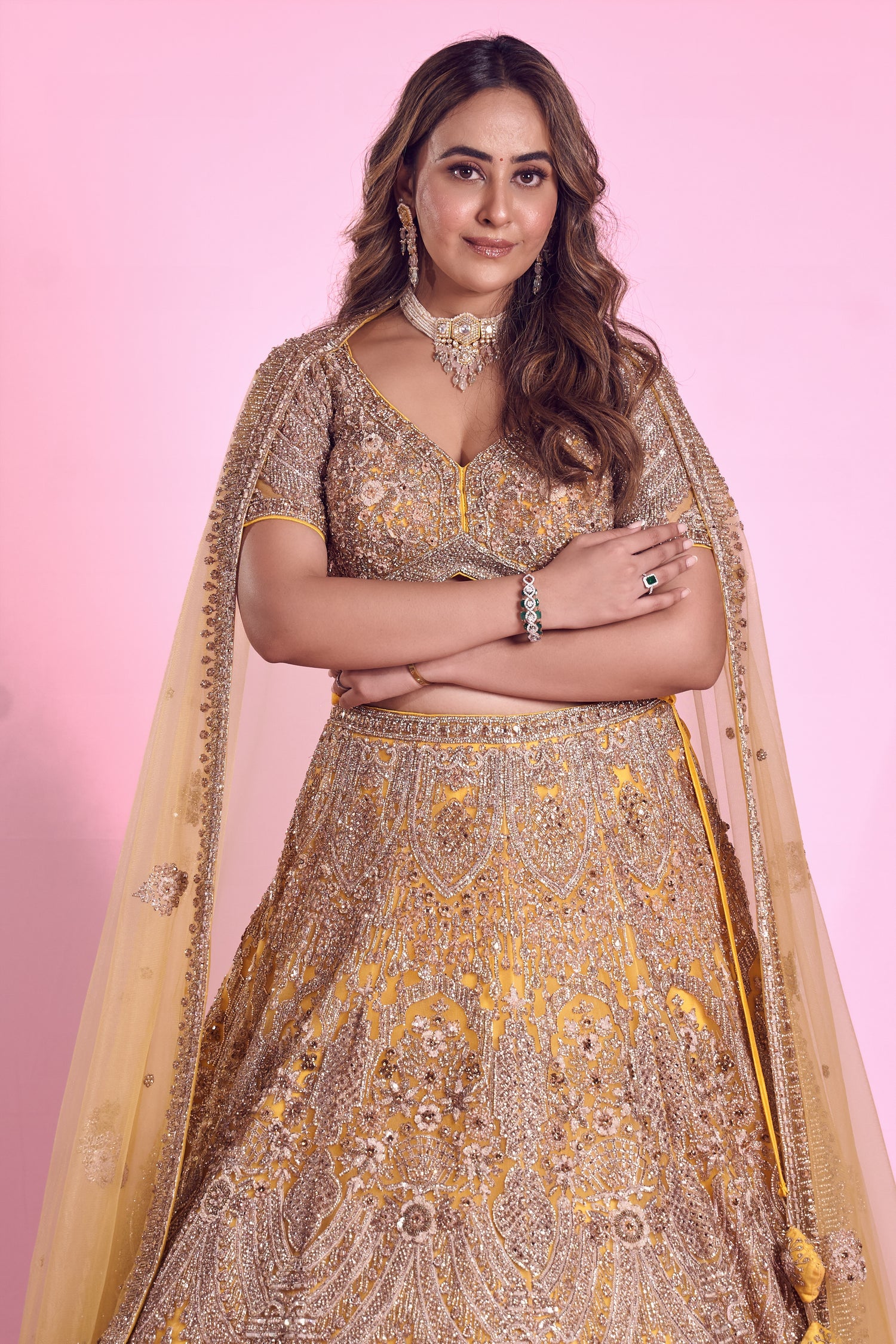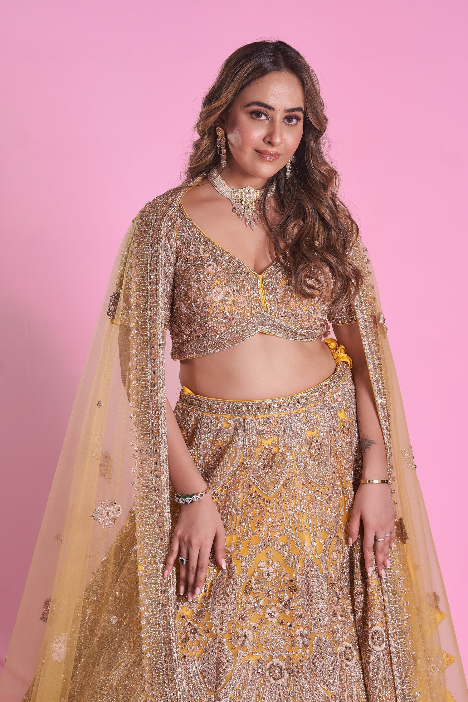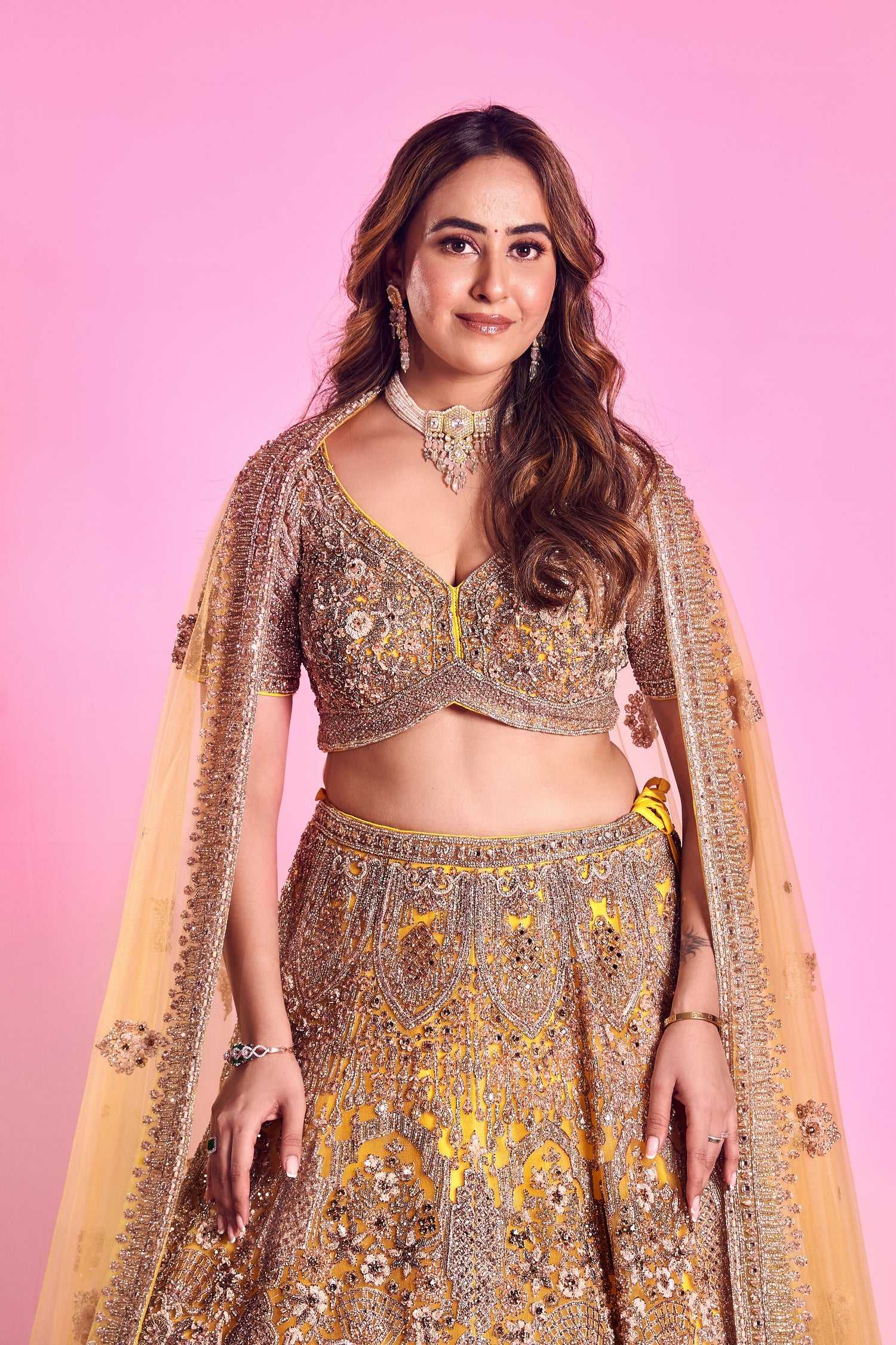 The lehenga is a long, flared skirt that matches the choli in terms of design. It features an intricate pattern of embroidery in gold tones, with a mix of sequins, beads, and fine thread work, creating a rich and luxurious look.The blouse is heavily embellished with intricate embroidery, beads, and sequins. The neckline has a V-shaped cut, and the short sleeves are detailed with delicate embroidery.The sheer dupatta, draped over the shoulders, complements the outfit with its fine embellishments and borders that match the embroidery on the lehenga and choli. It adds an elegant and traditional touch to the overall look.