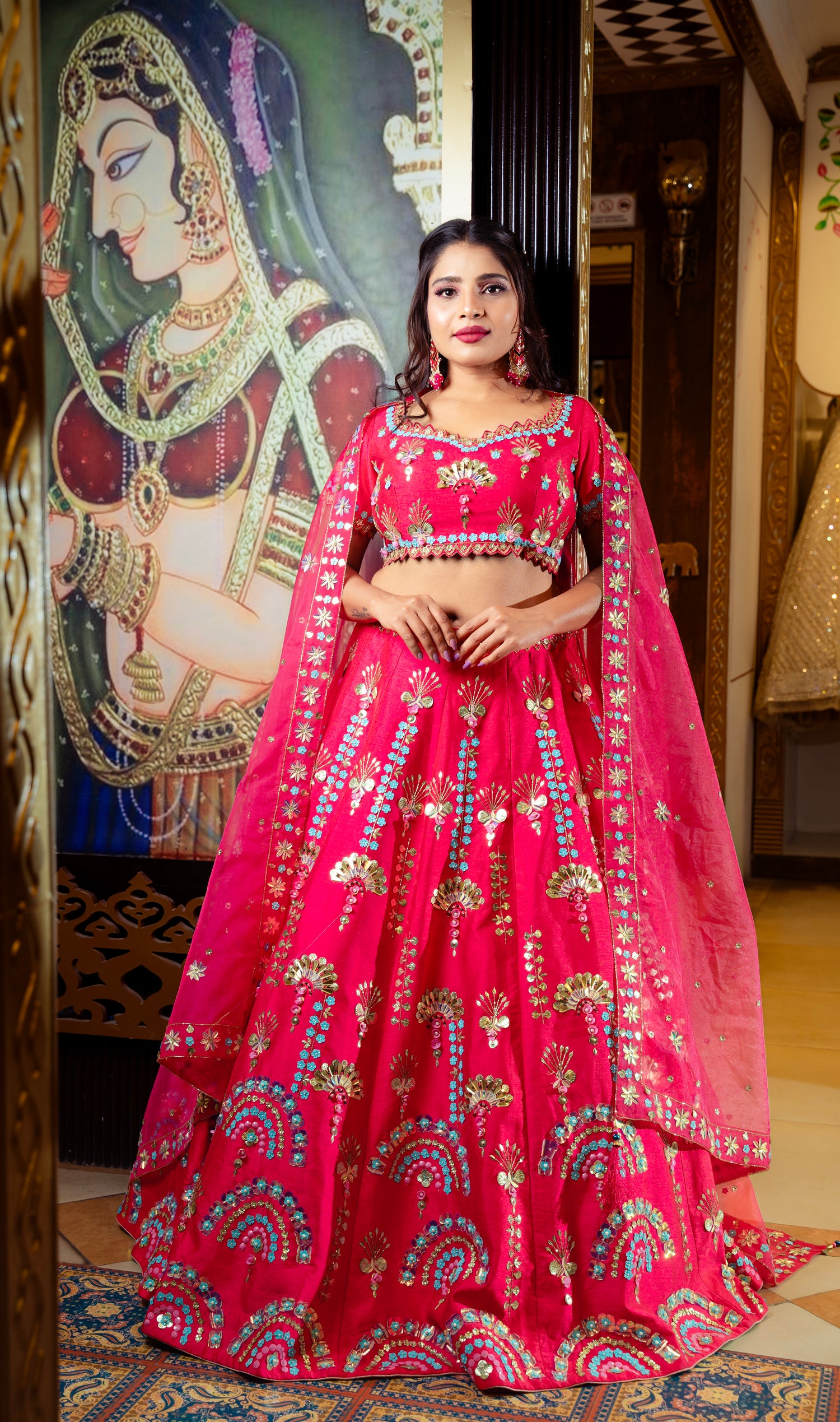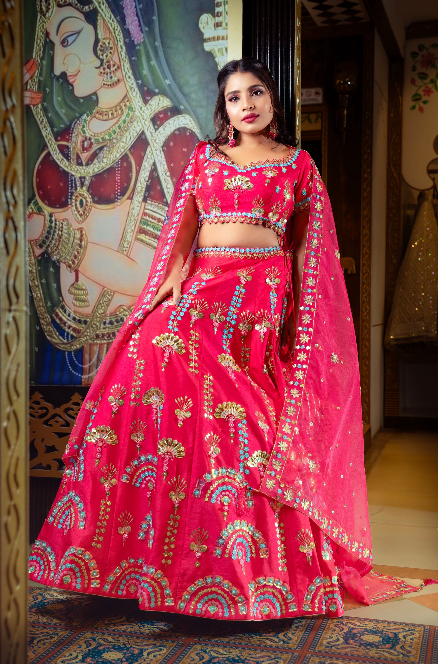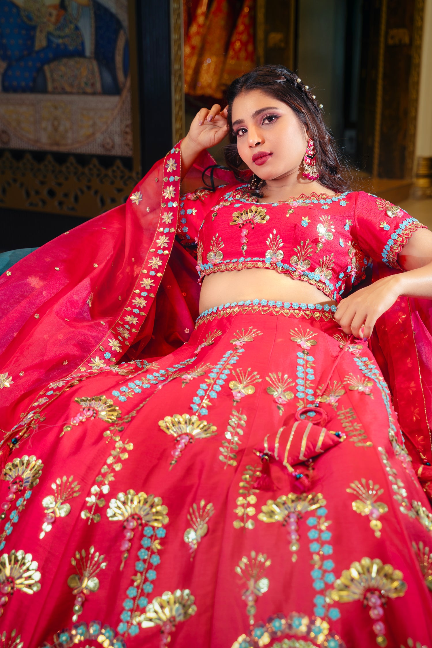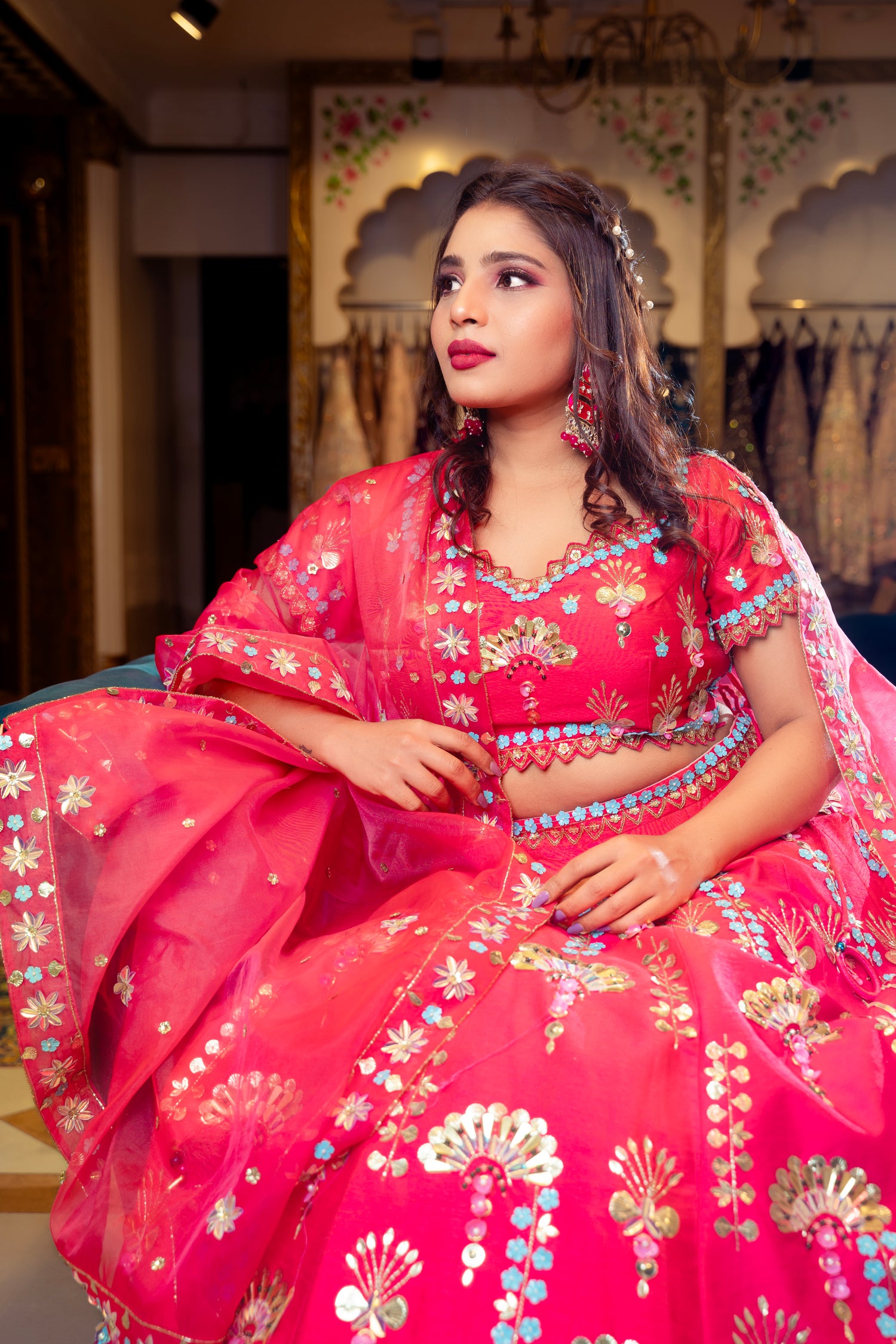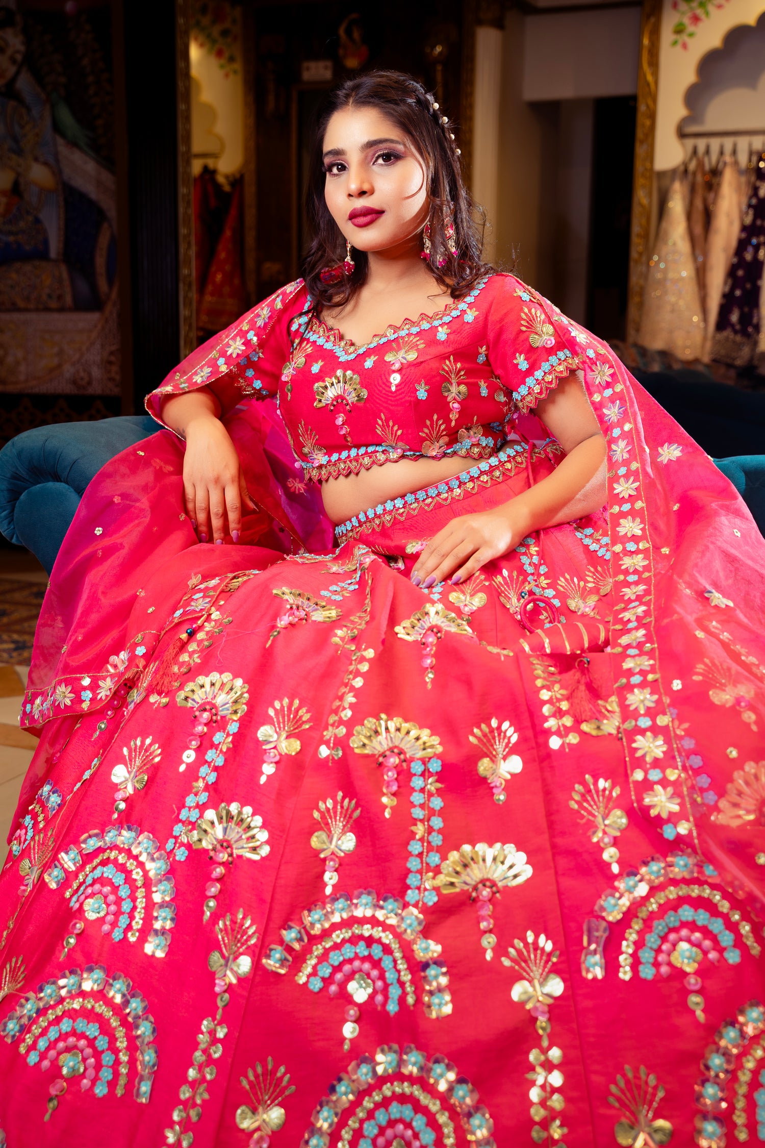 The woman accessorizes with a statement necklace that adds a touch of traditional glamour. Overall, this outfit is stunning and ideal for weddings or festive celebrations, combining traditional design elements with a modern twist.