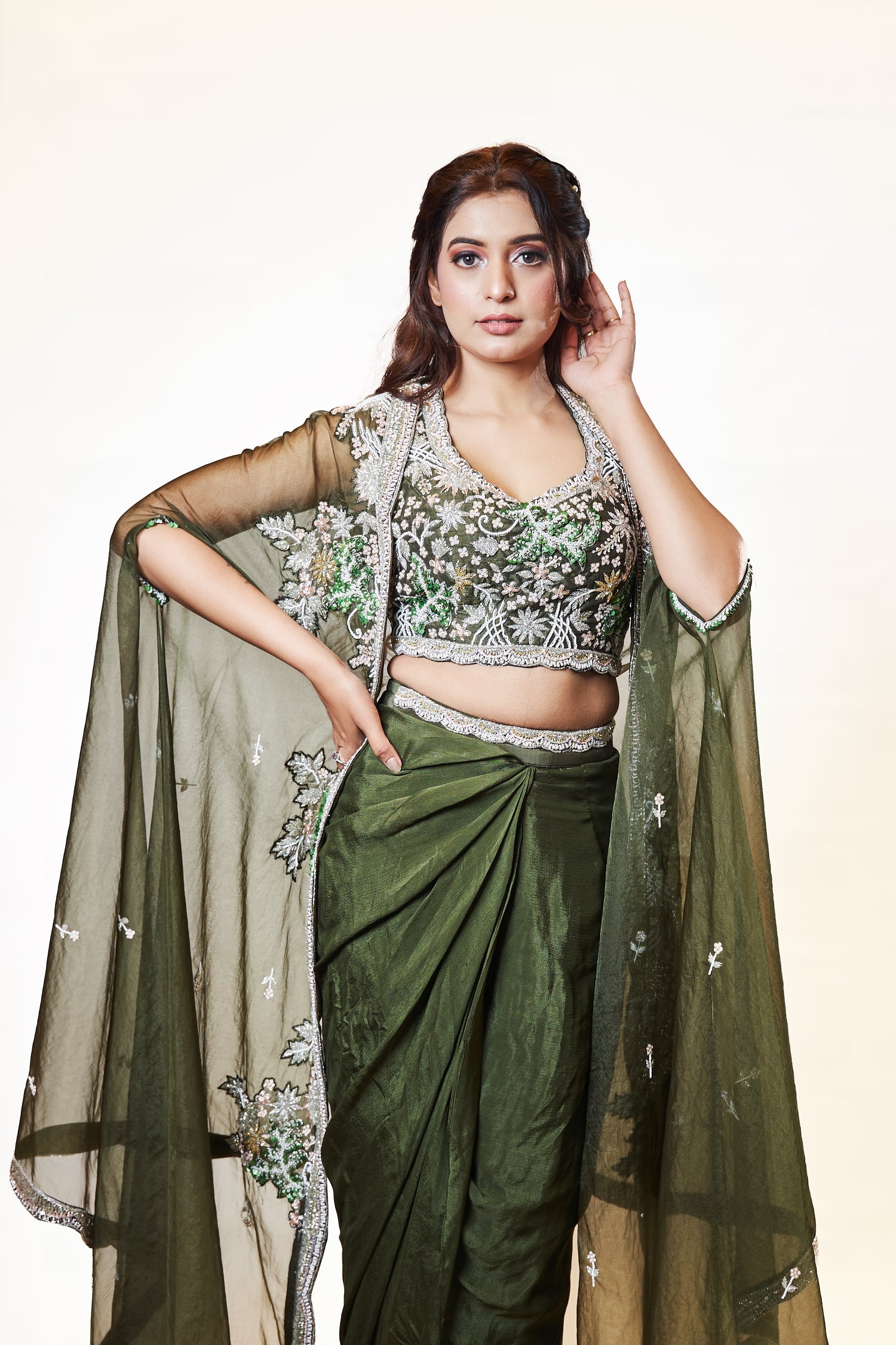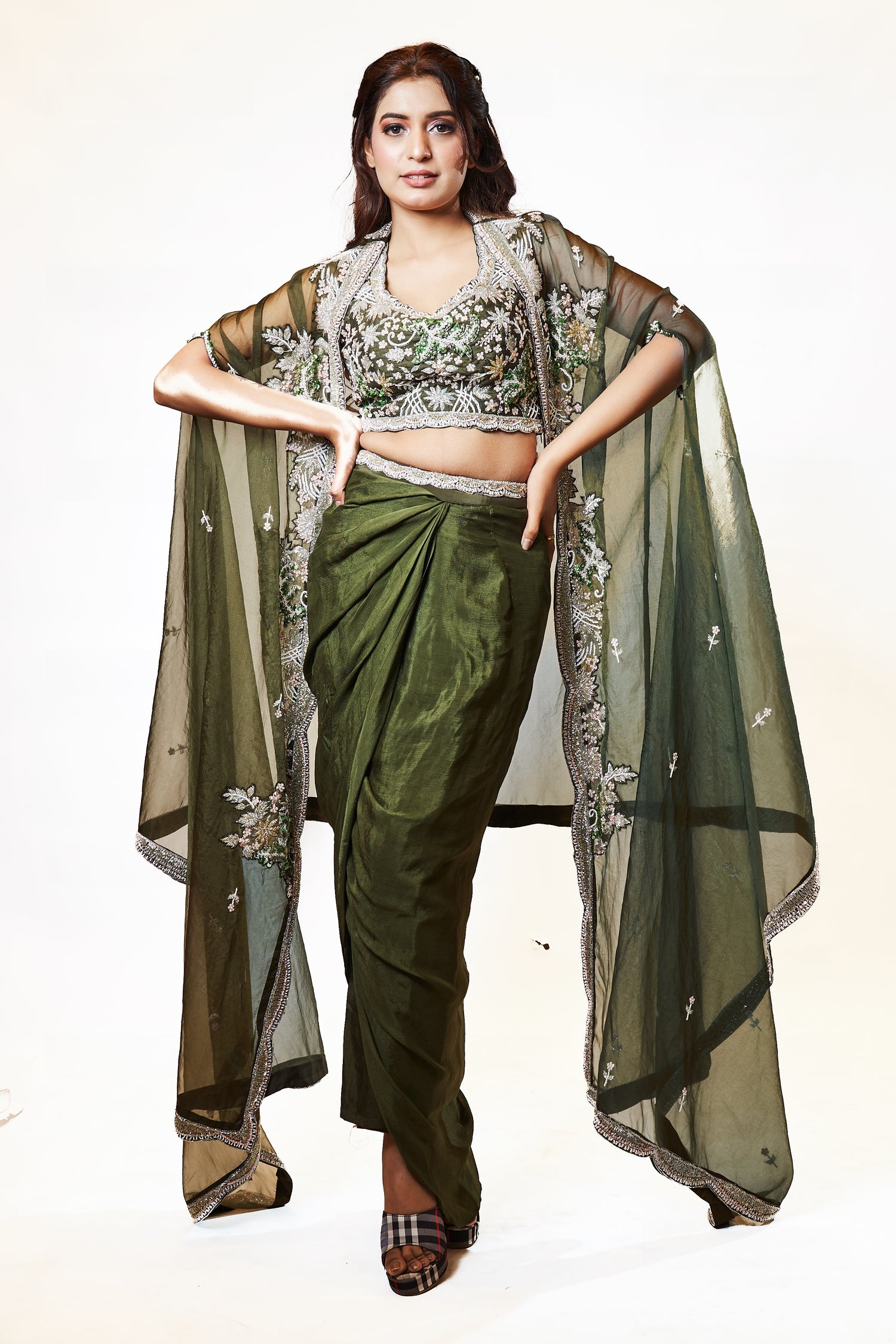 This dress features fusion with a heavy embroidered cape and paired with georgette dhoti and embroidered crop top
