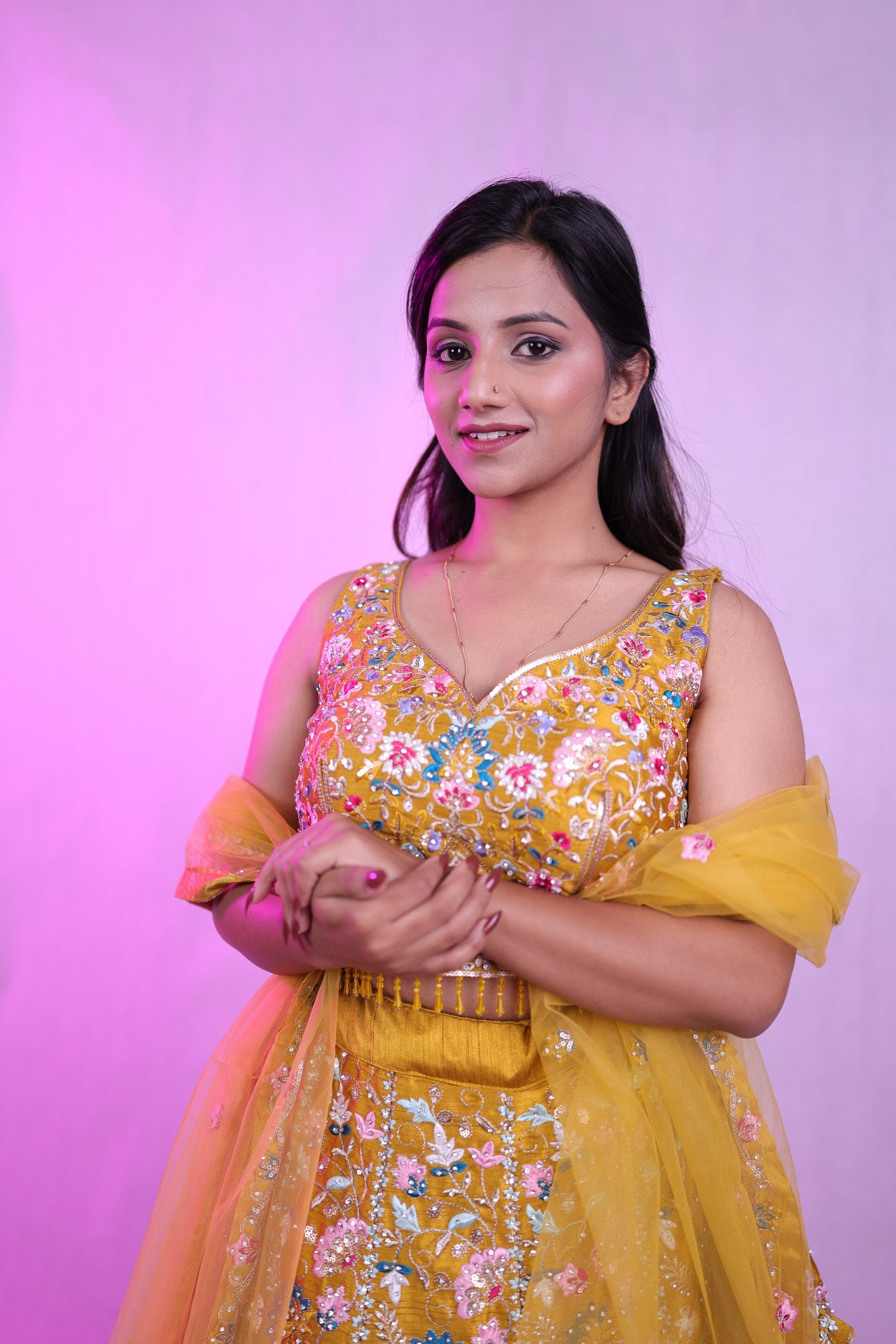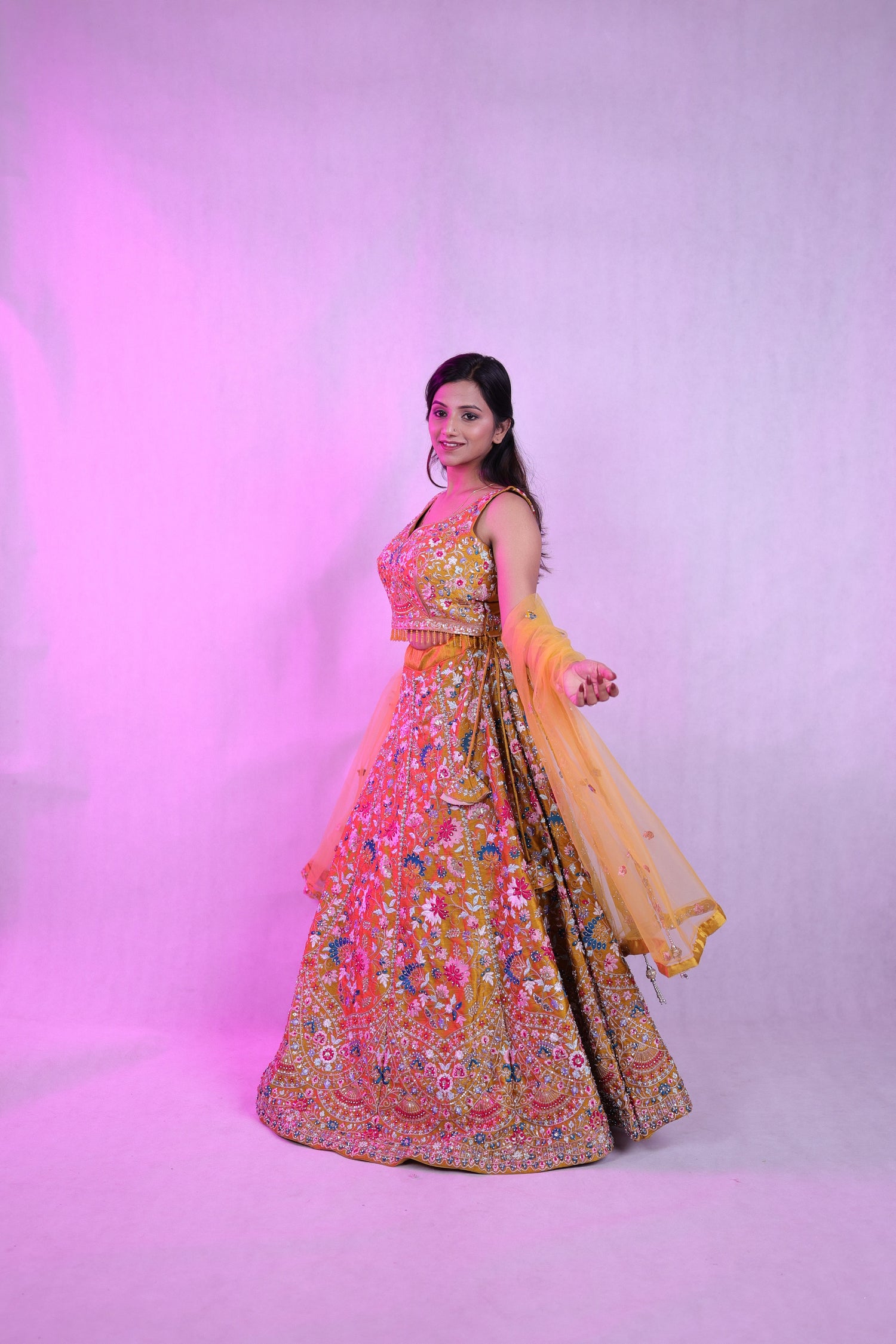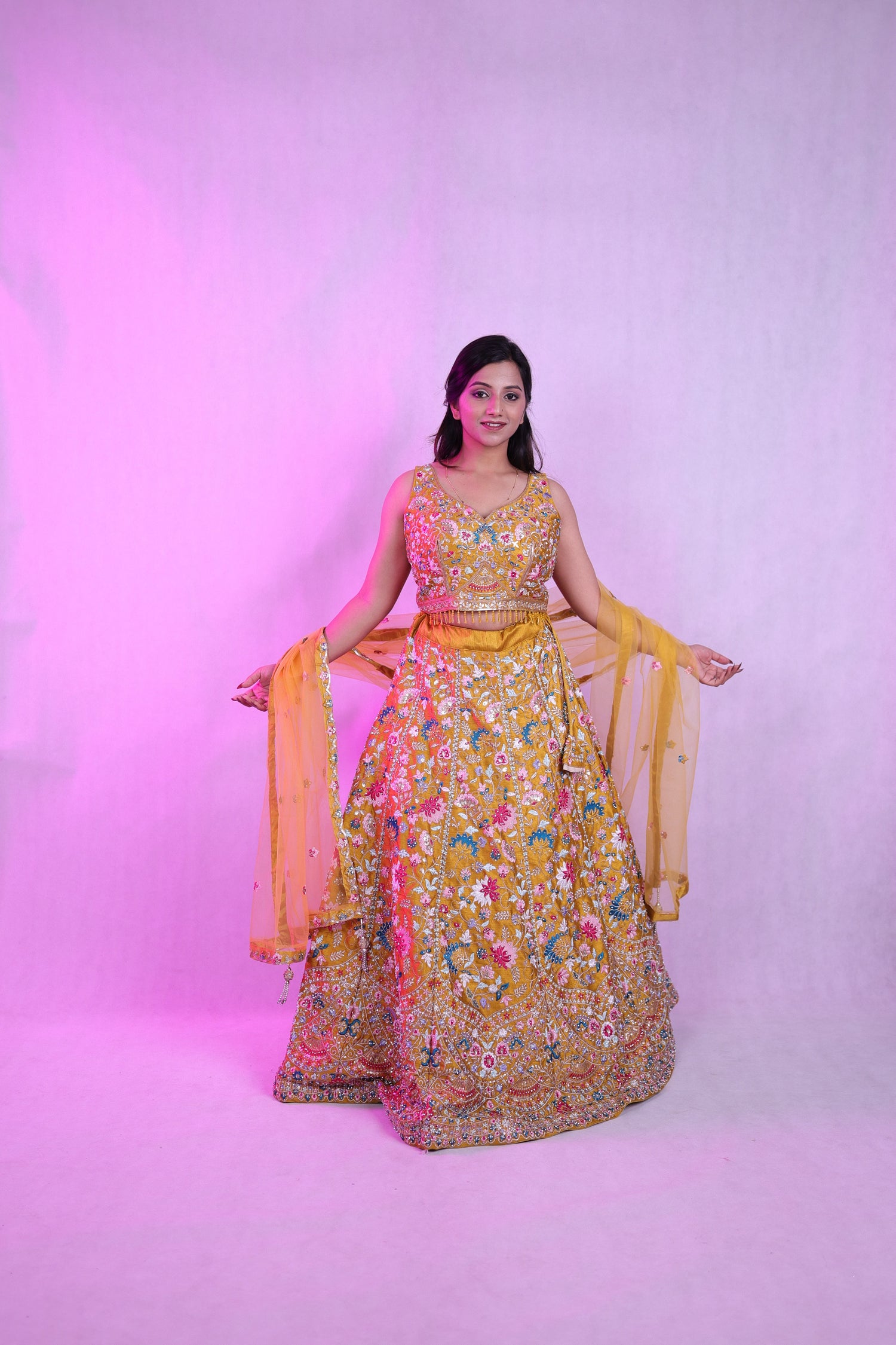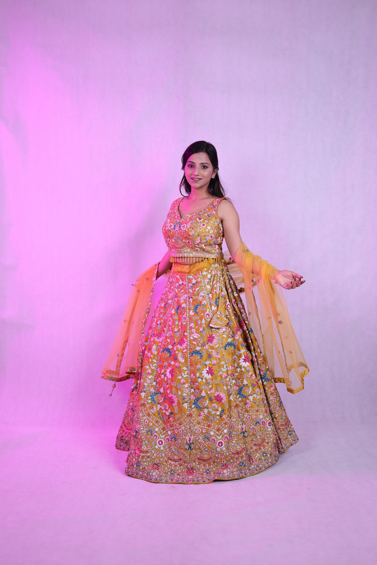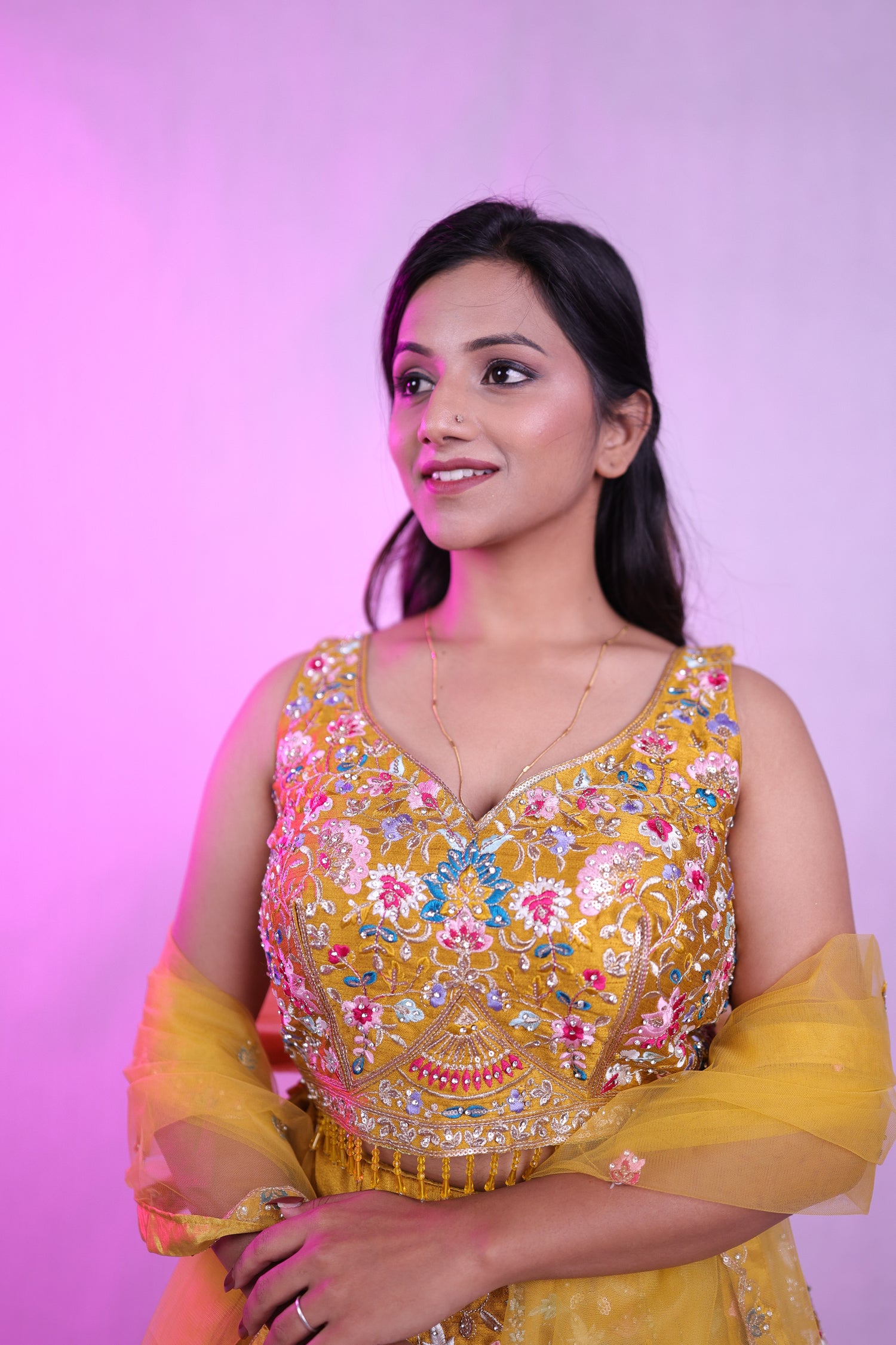 This lehenga is embellished with beautiful floral themed threadwork, reminding us of nature. The colours merged with mustards gives a perfect Haldi ceremony vibes as it is meant to be more colourful