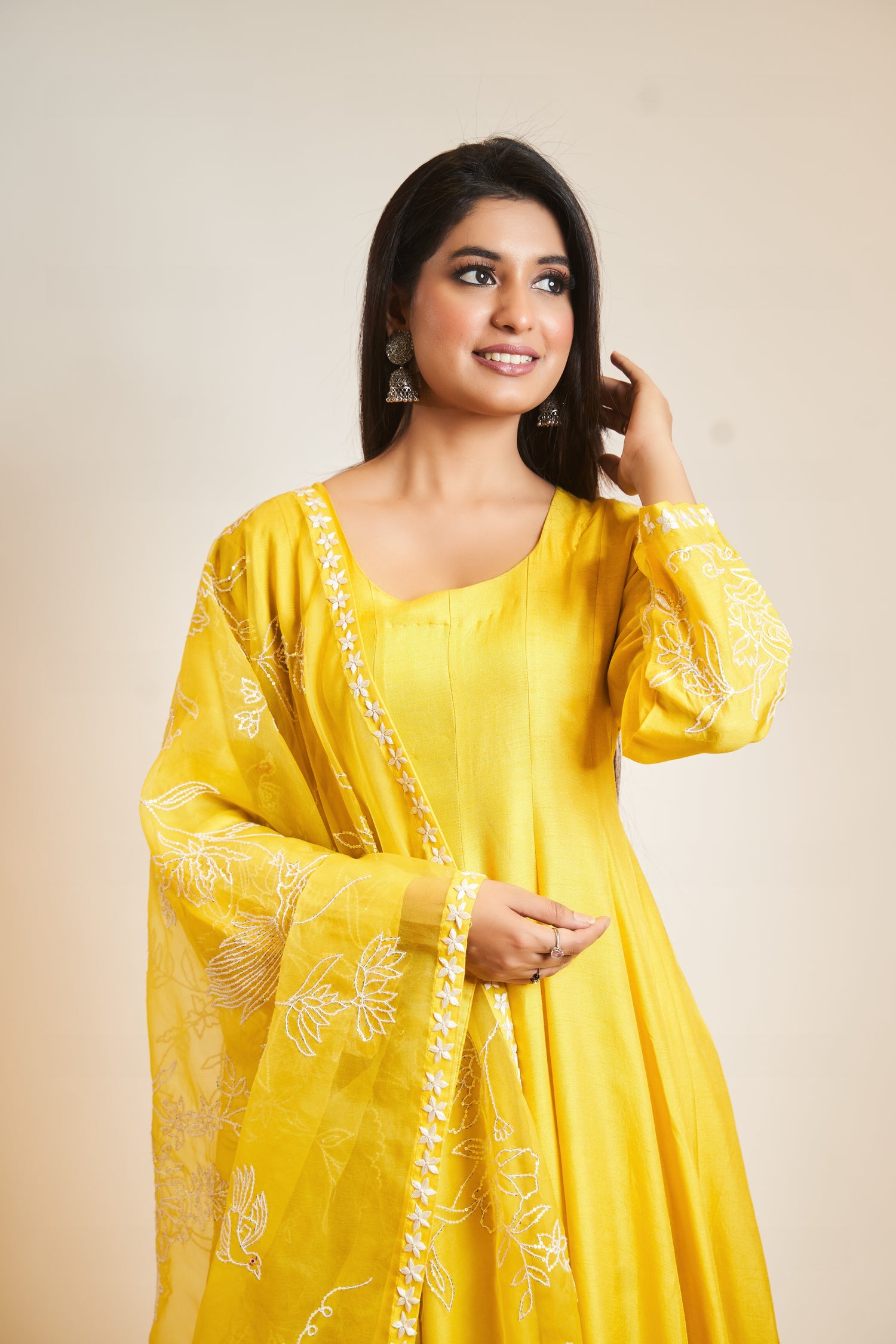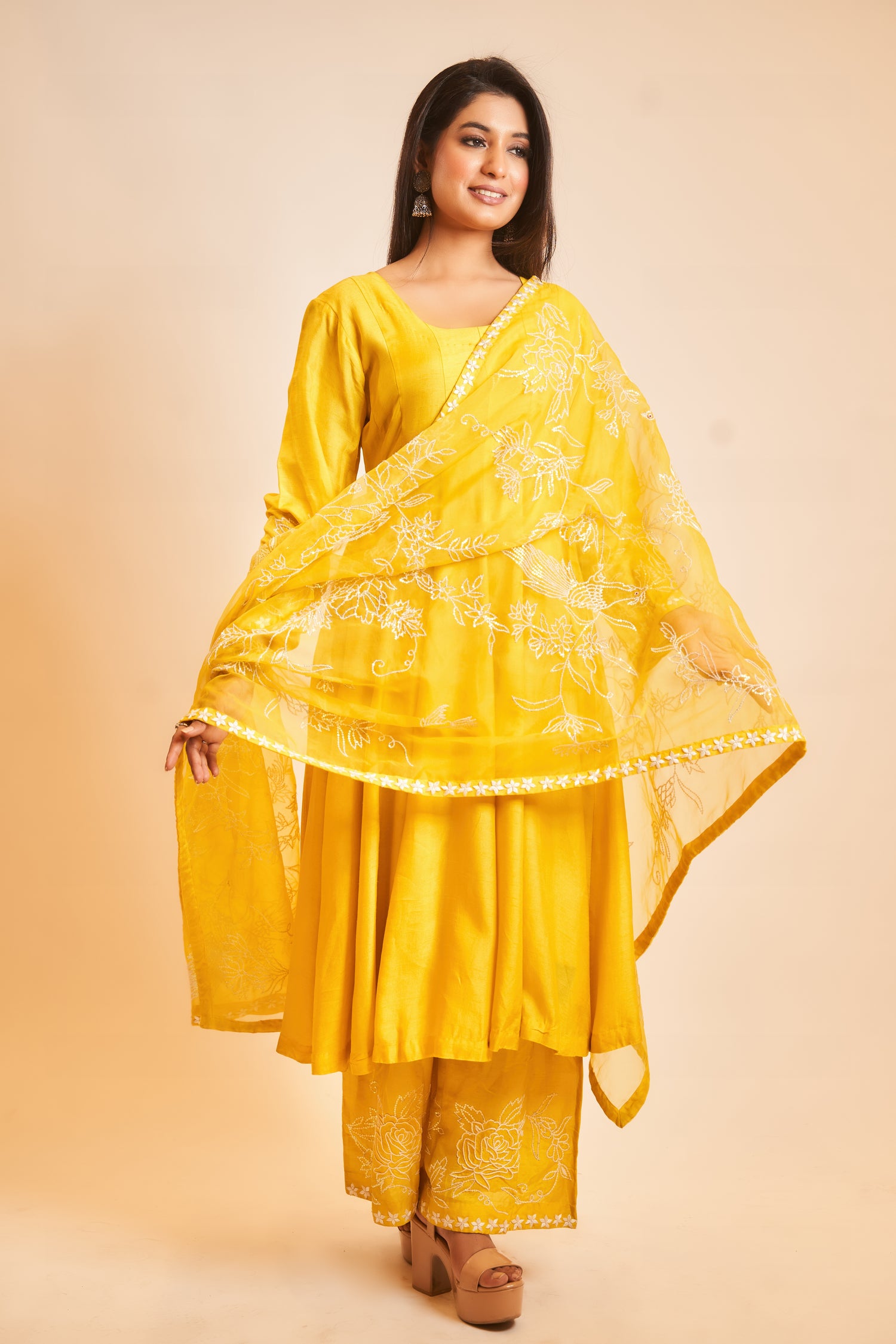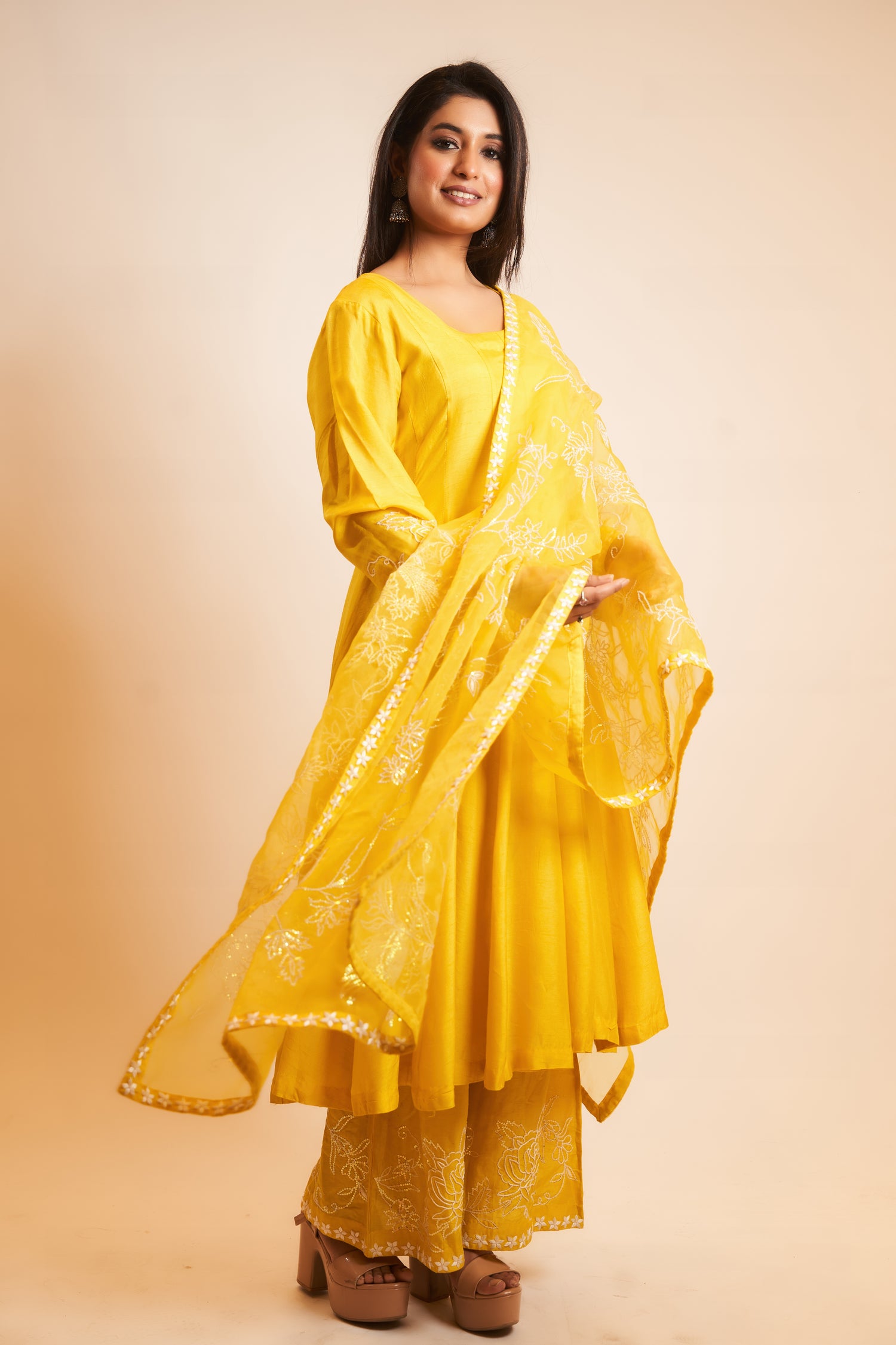 The outfit is bright yellow traditional set featuring a mid-length embroidered anarkali kurta and matching wide-legged palazzo pants The anarkali kurta with full flaire and paired with sheer dupatta with border detailing