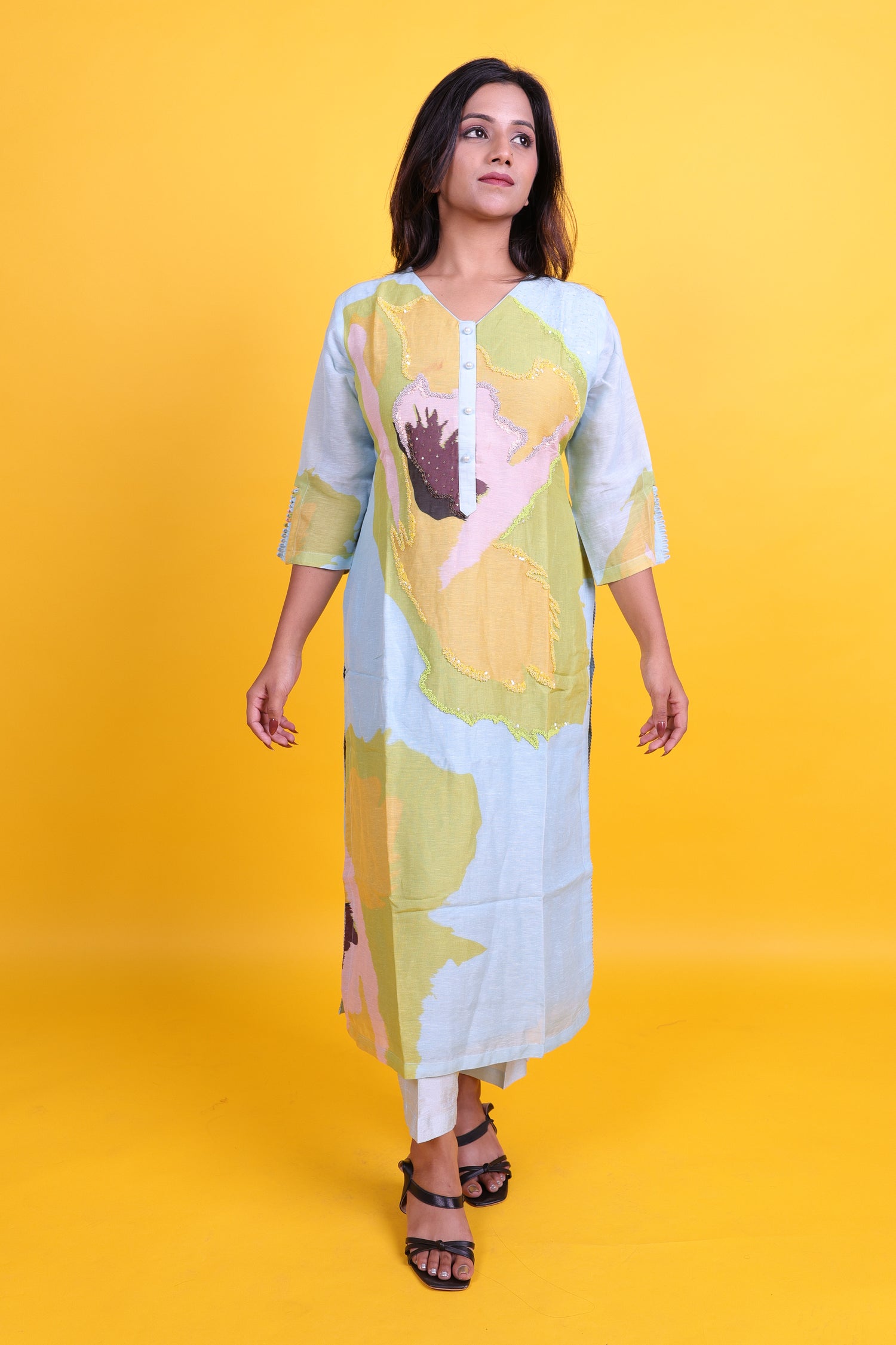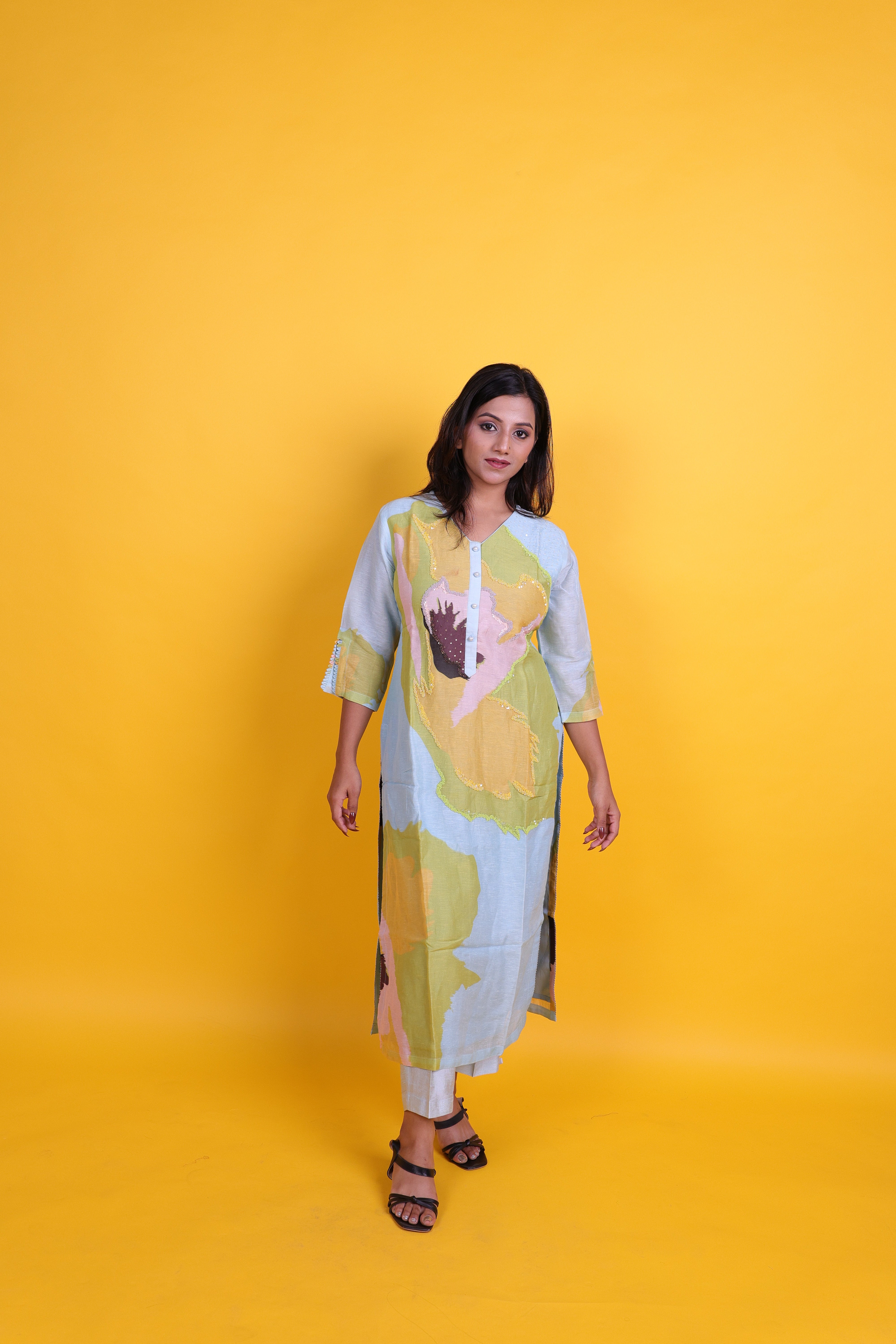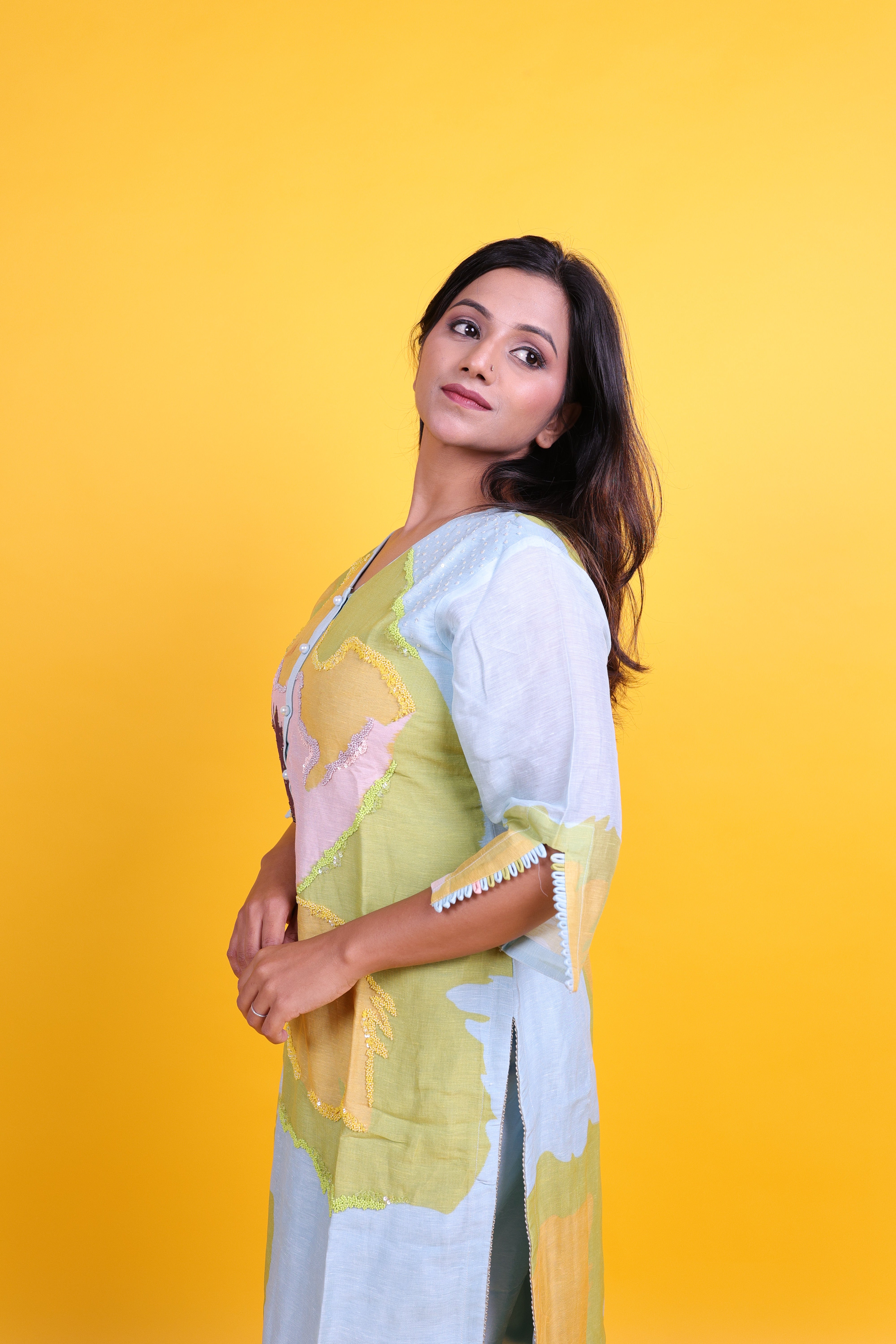 Soft yet striking, this pastel colourblock outfit blends dreamy hues with modern design. The look features a relaxed fit kurta with trousers . The gentle contrasts create a soothing visual rhythm that feels fresh and contemporary.