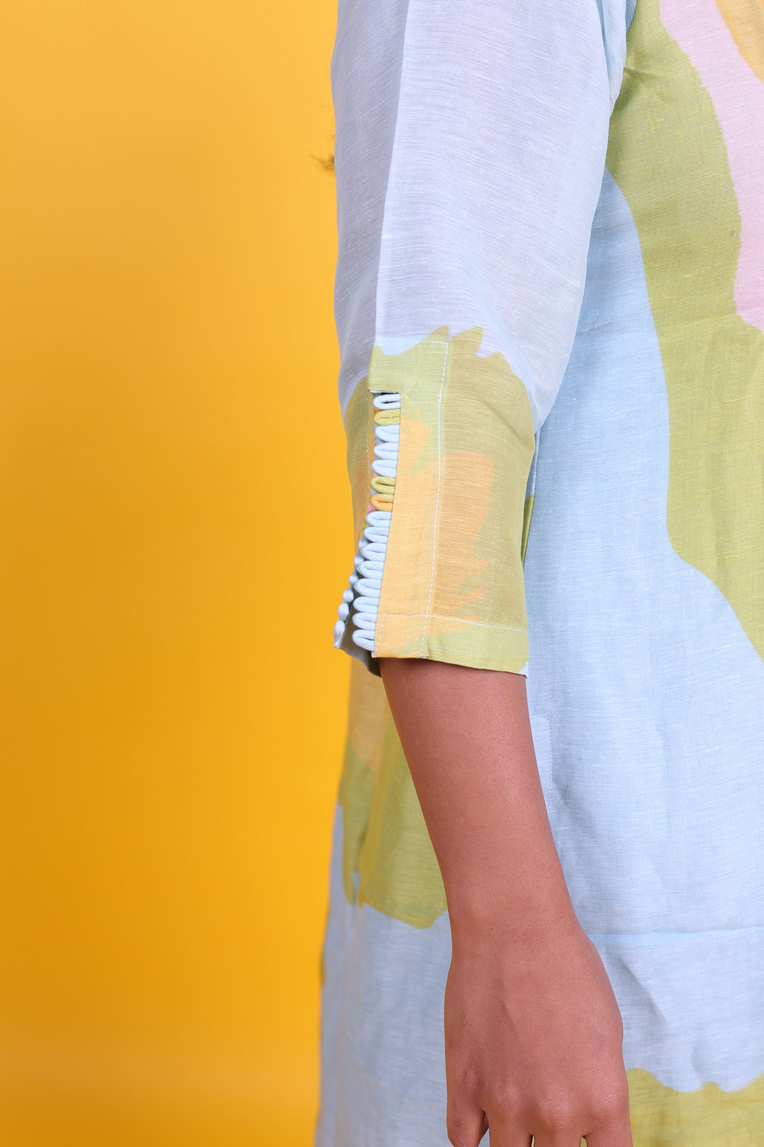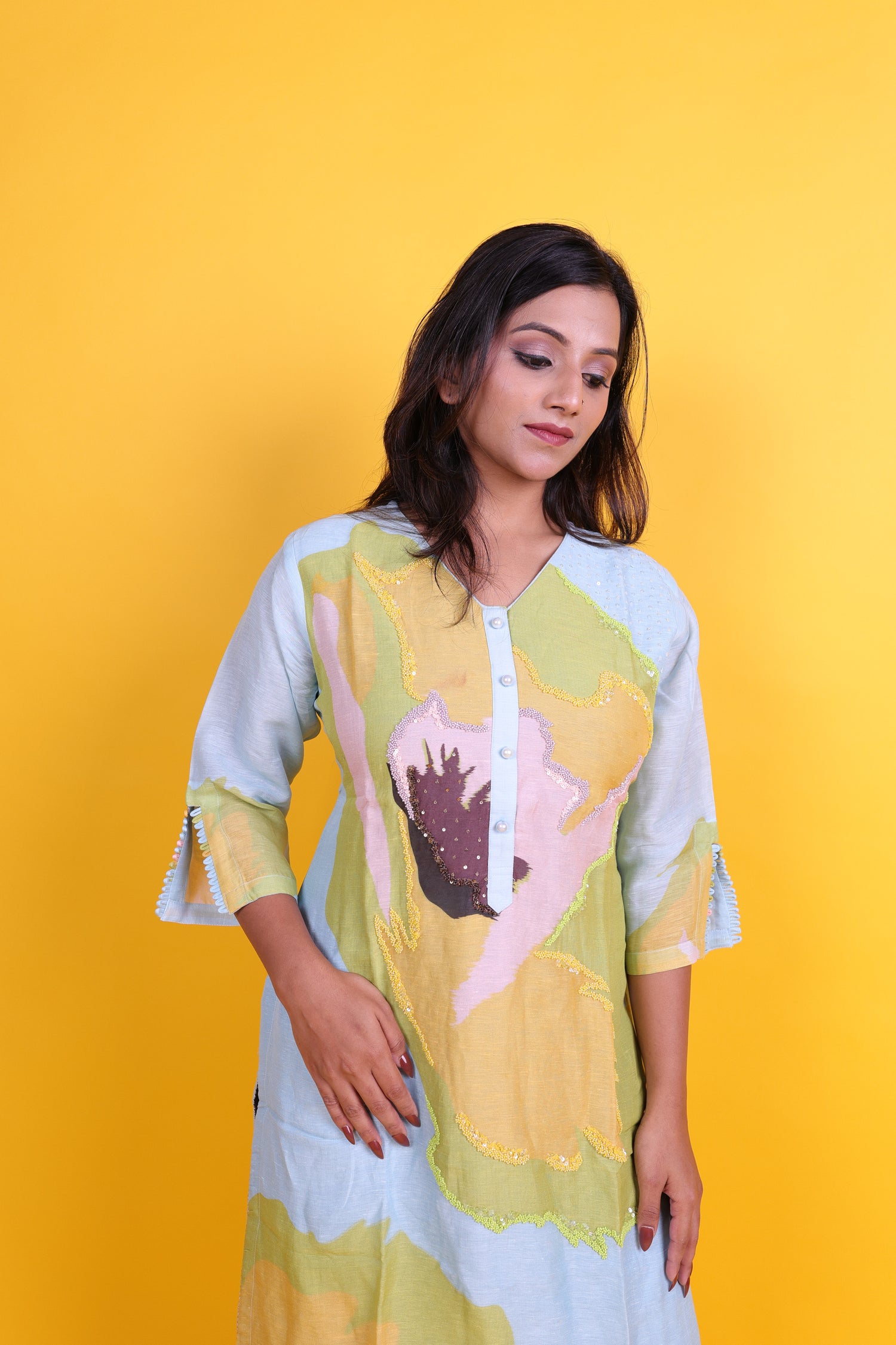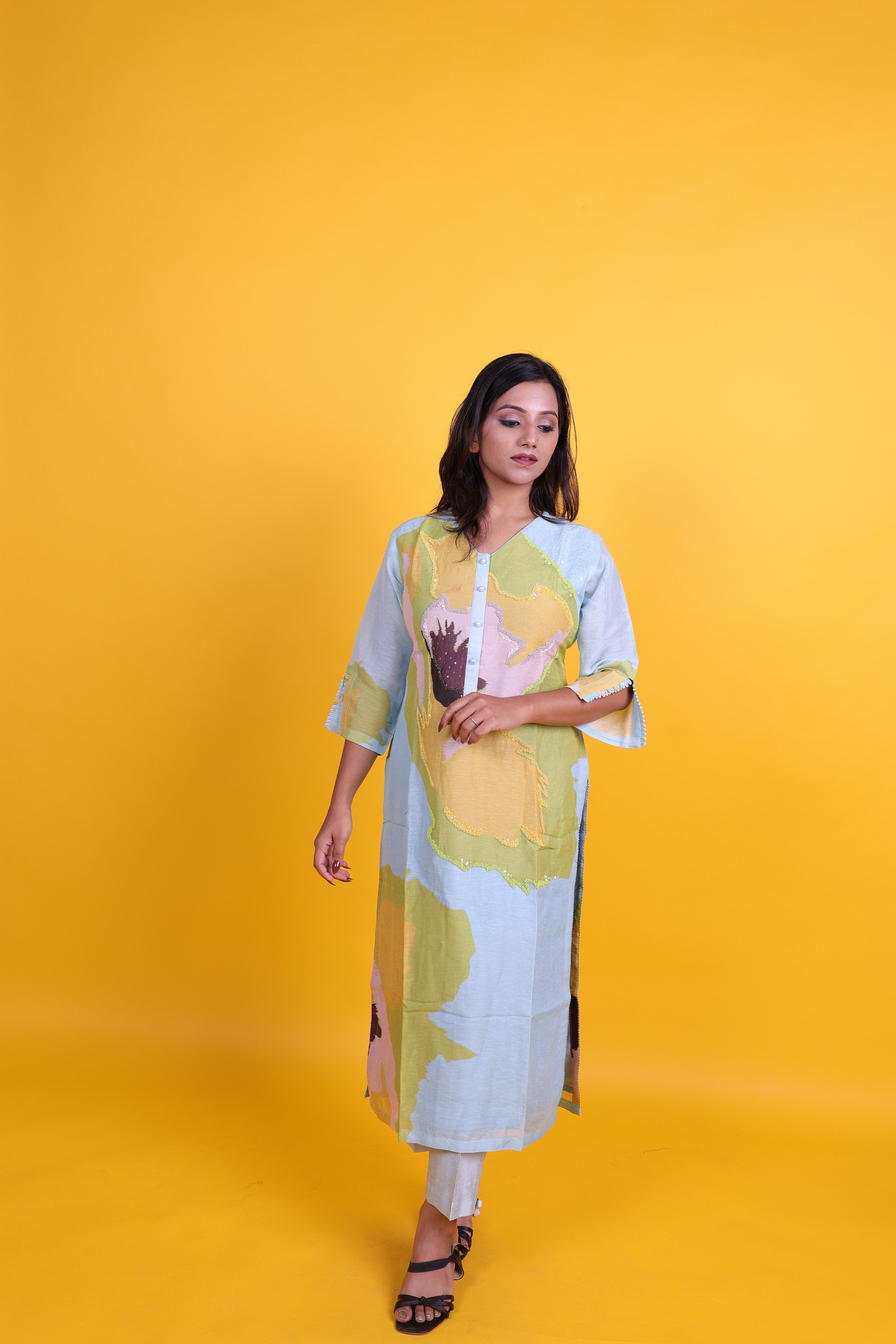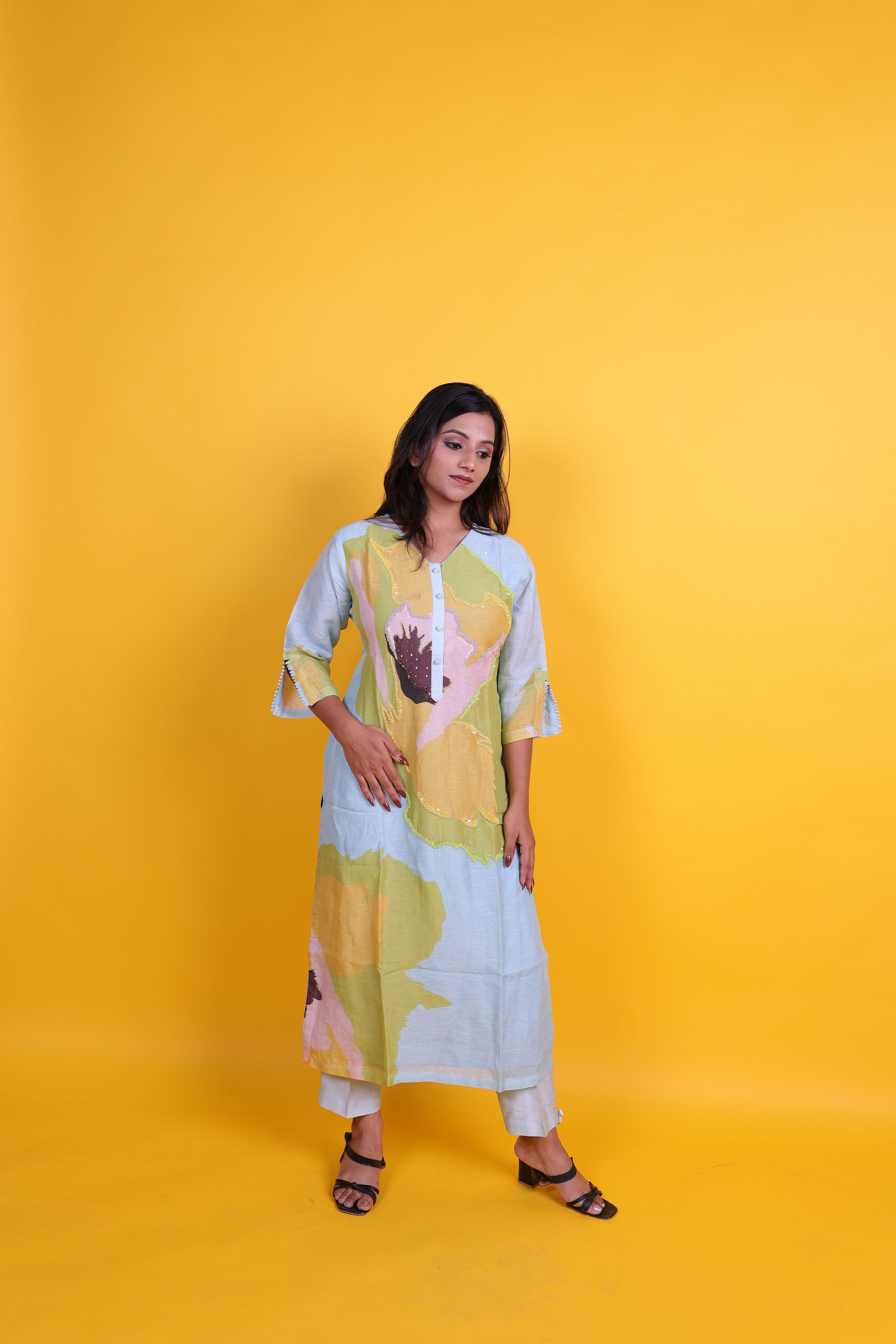 Soft yet striking, this pastel colourblock outfit blends dreamy hues with modern design. The look features a relaxed fit kurta with trousers . The gentle contrasts create a soothing visual rhythm that feels fresh and contemporary.