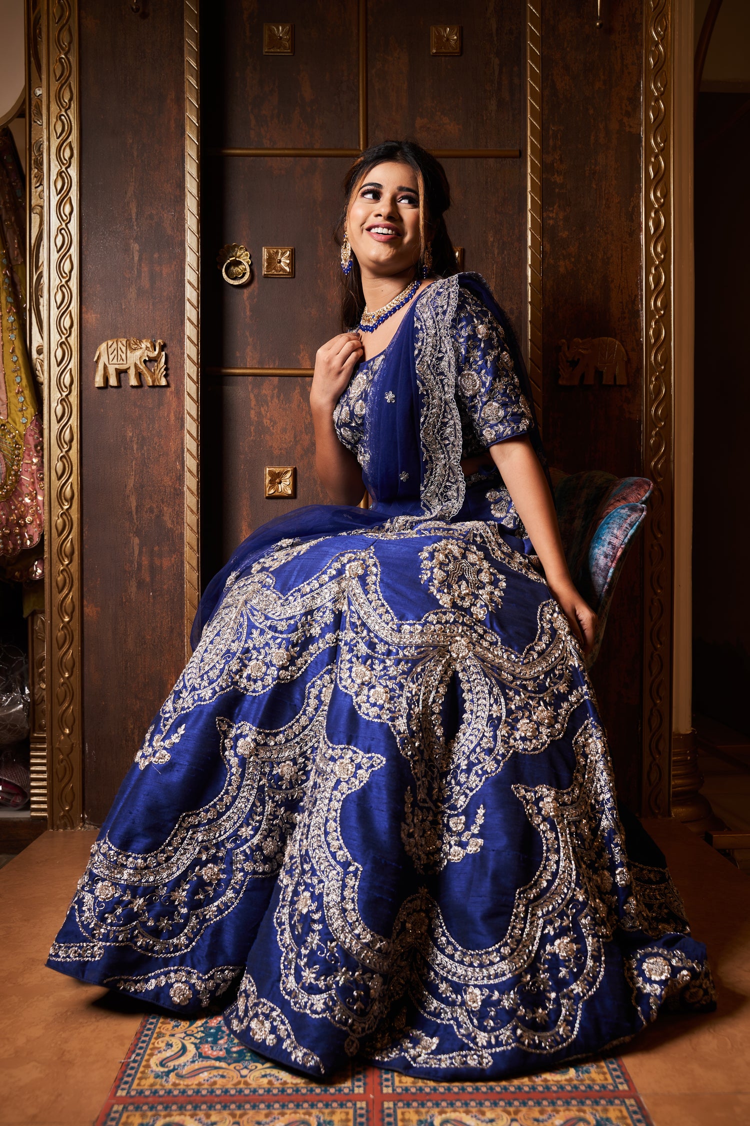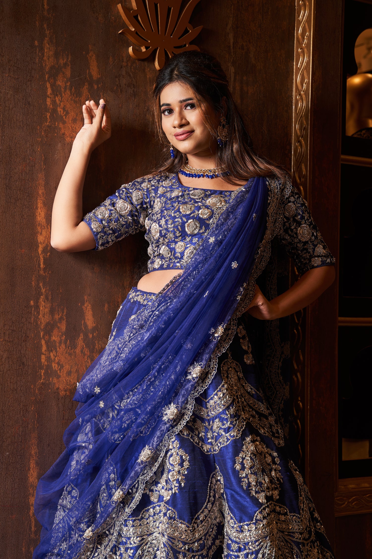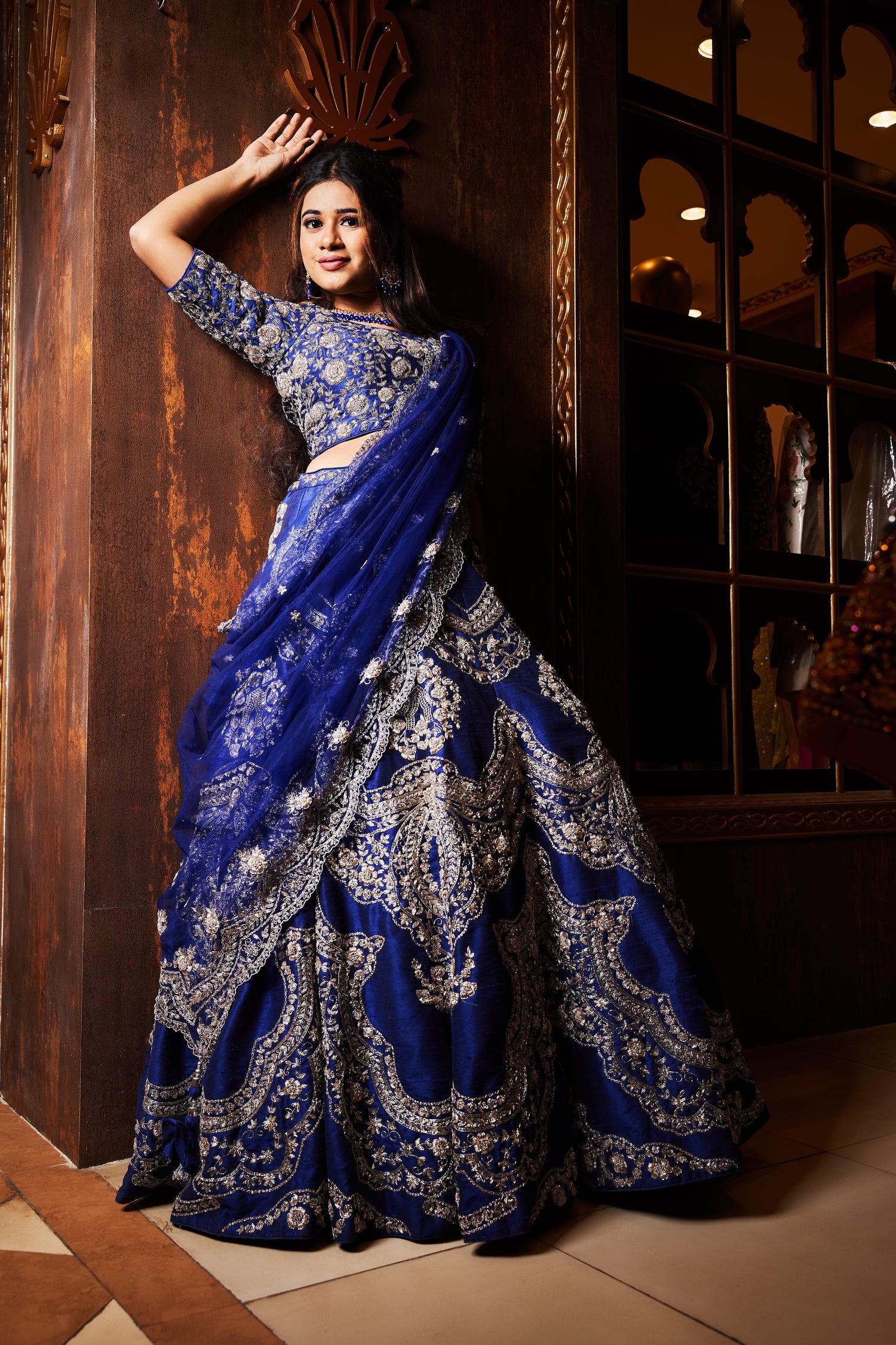 The dress in the image is a luxurious traditional Indian lehenga. It features a rich blue color as the base, intricately embroidered with silver zardosi work. The embroidery is highly detailed, with ornate floral and paisley patterns adorning the skirt, blouse, and dupatta . The blouse has elbow-length sleeves and a round neckline, while the skirt is voluminous with heavy embellishments, giving it a regal and festive appearance. The dupatta draped over the shoulder adds an elegant touch, complementing the overall look of the outfit. This attire is perfect for weddings or grand celebrations.