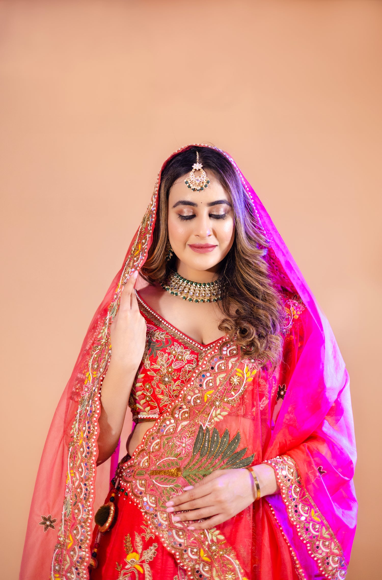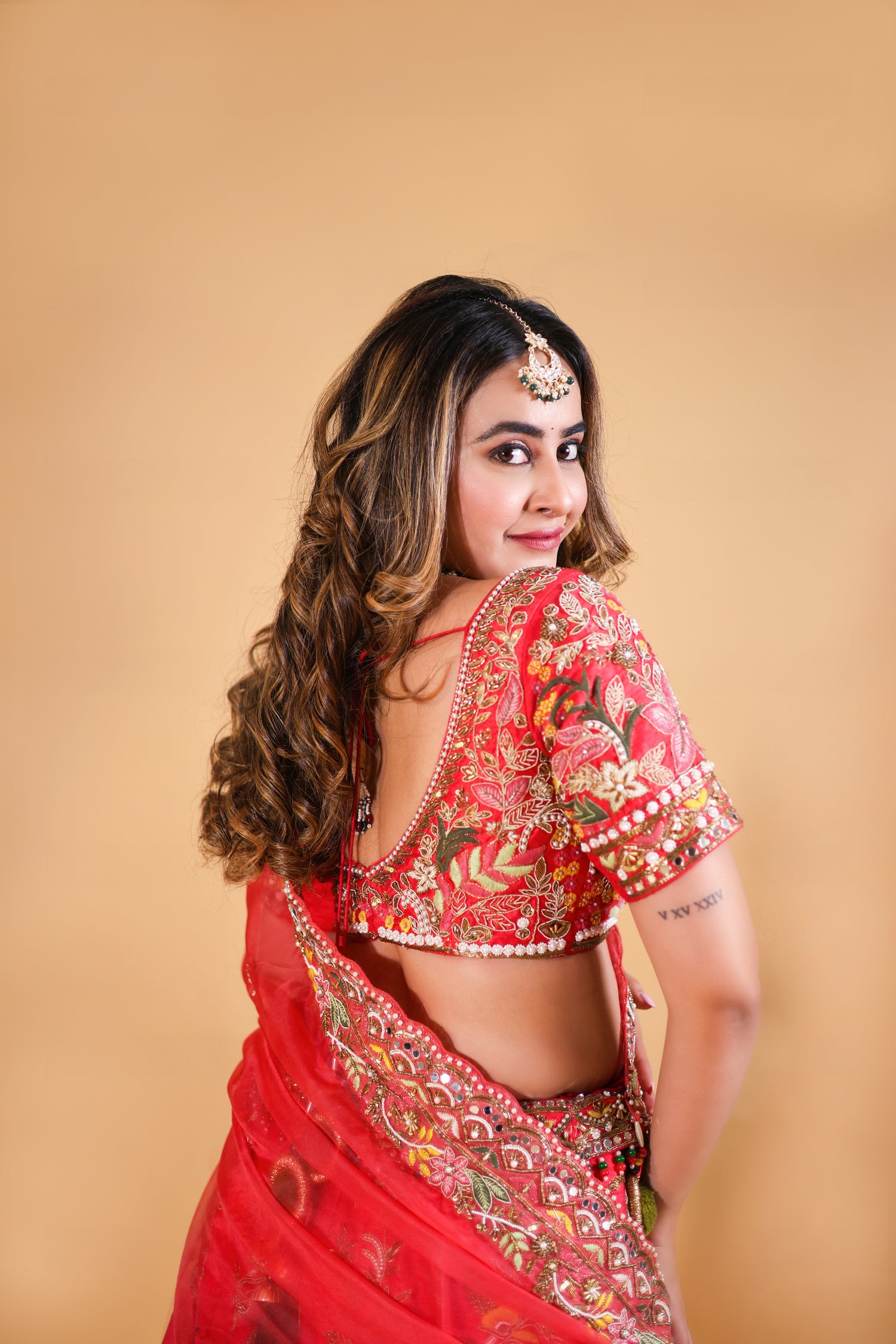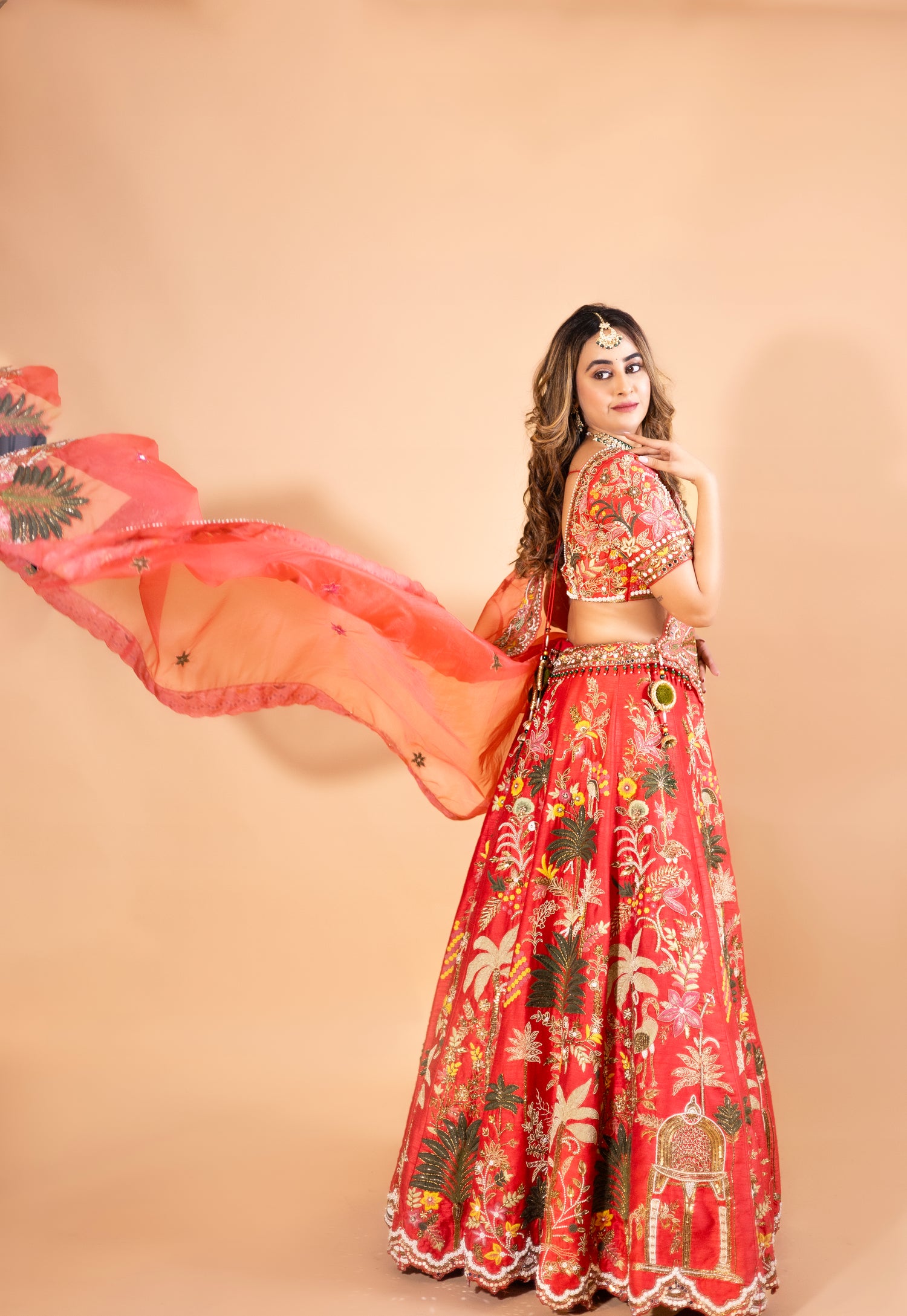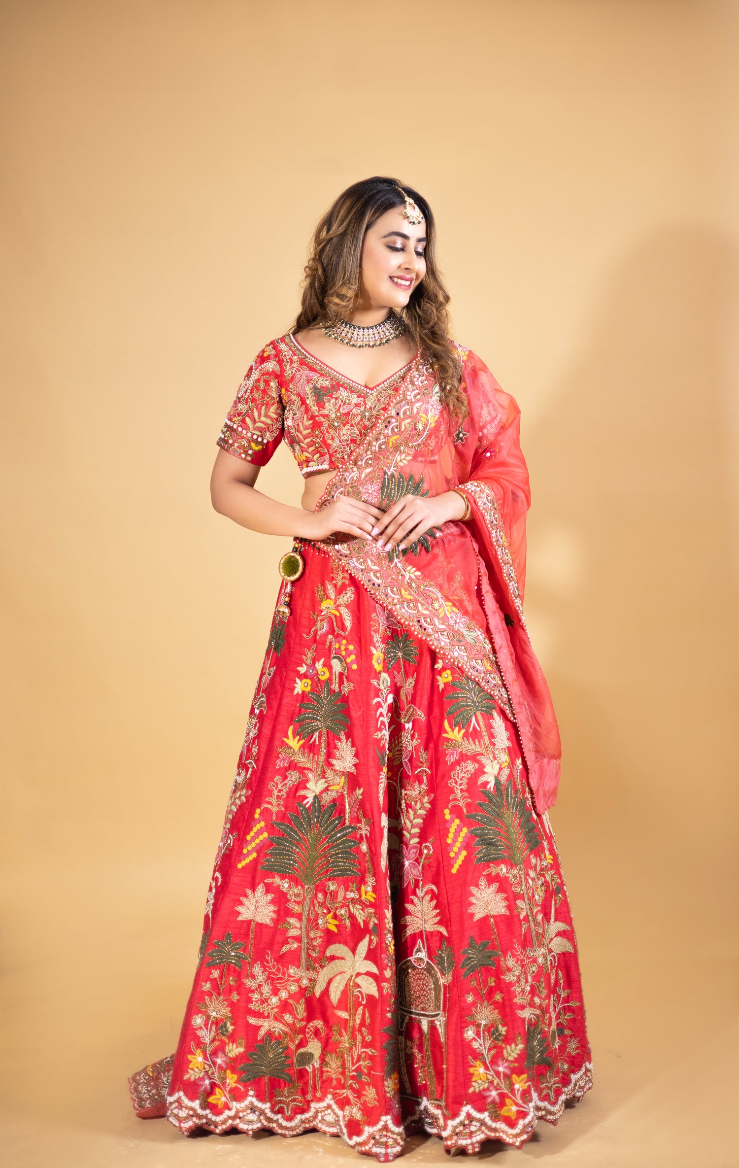 The features a red lehenga, richly adorned with intricate gold embroidery and embellishments. The design features traditional floral and nature-inspired motifs that give the outfit a regal and festive feel. The blouse has a deep V-neck with ornate detailing, and the dupatta draped over one shoulder adds to the traditional, bridal-like appearance.